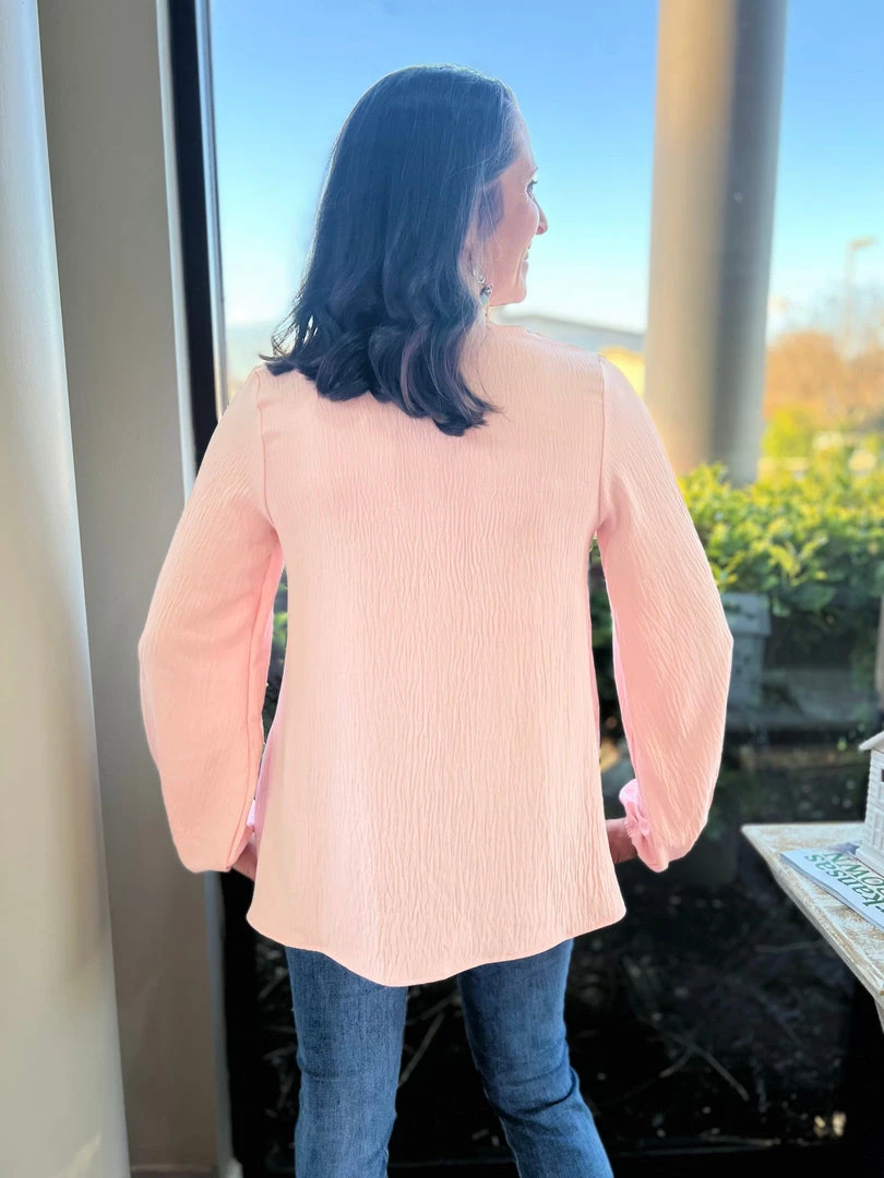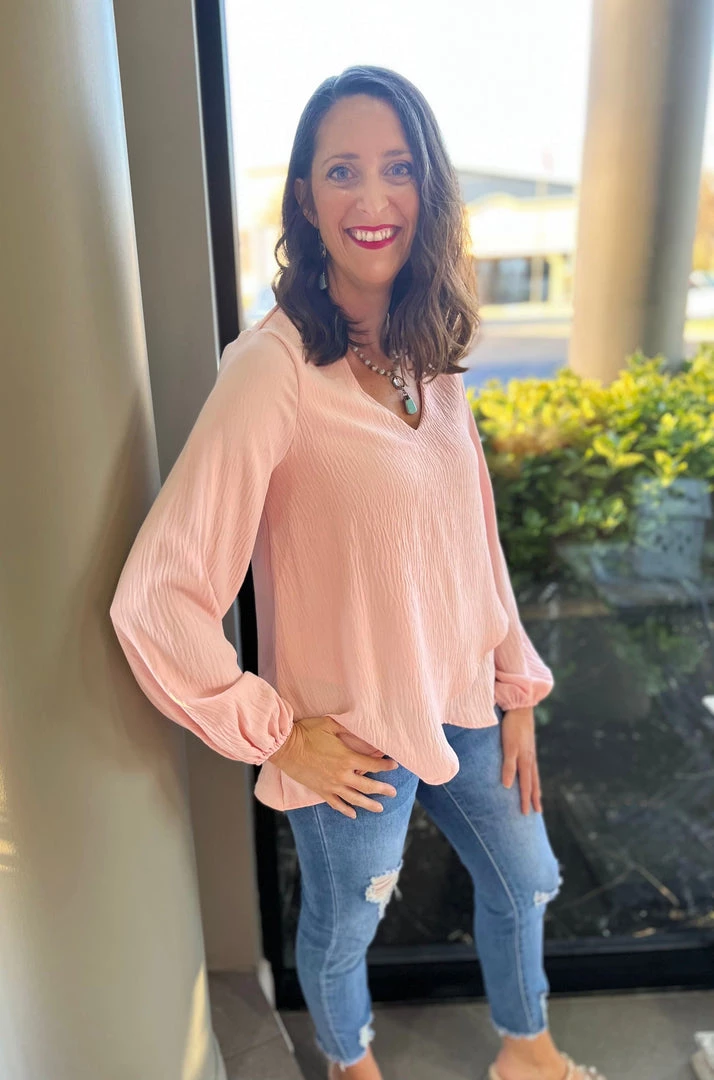 What a great color and style on this top! Solid pink V-neck top with long sleeves. Elastic at wrists makes the sleeve length adjustable to your preference. Front layered asymmetrical cross over hem in the front. Woven and flowy fabric with a slight stretch. 100% Polyester