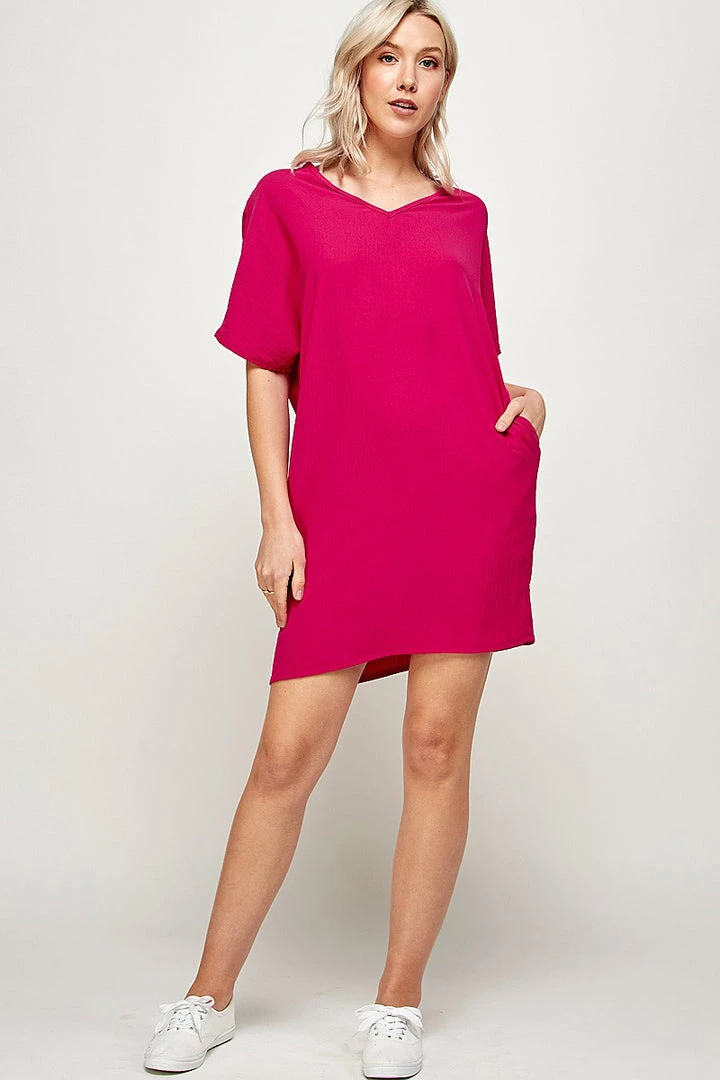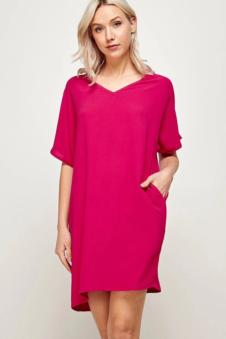 Solid V-neck dress with invisible side pockets. Relaxed loose fit made with an air flow fabric to keep you cool. Brand is 2Hearts. Fit is oversized.