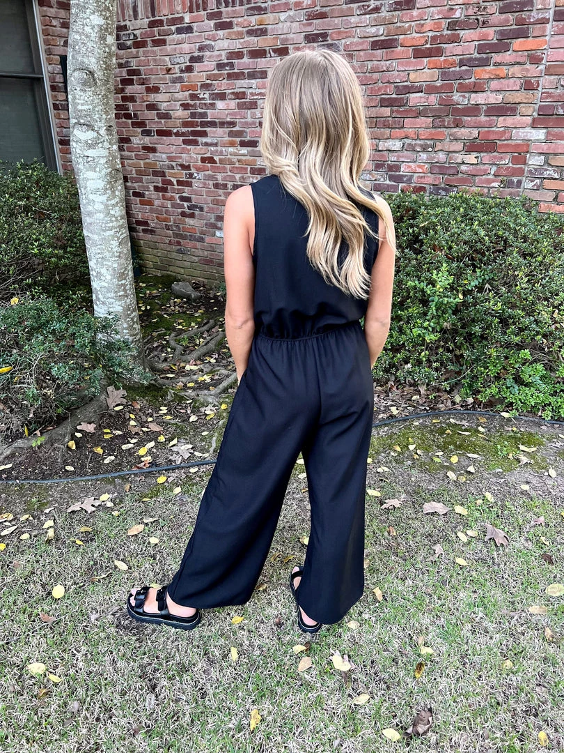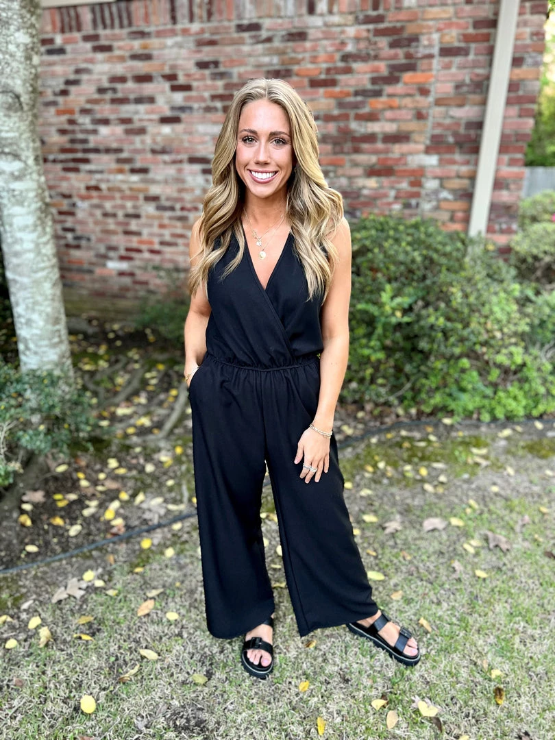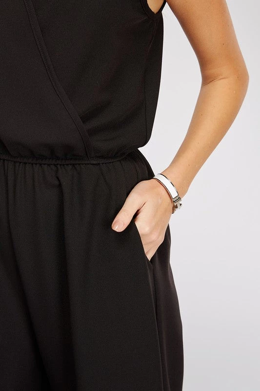 This jumpsuit has a cross over V-neckline and hip pockers. The waist is elastic for a comfortable fit. Cropped wide legs. Crepe fabric with a little stretch. 95 % Polyester, 5% Spandex