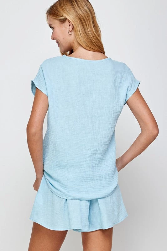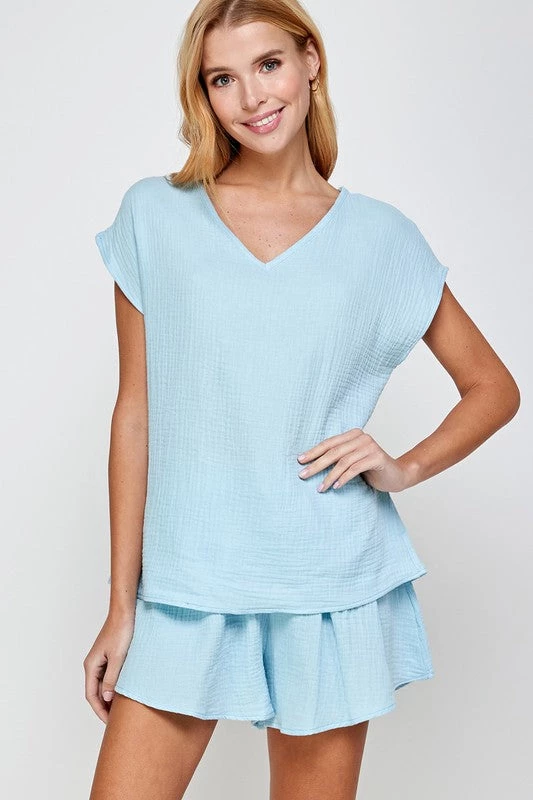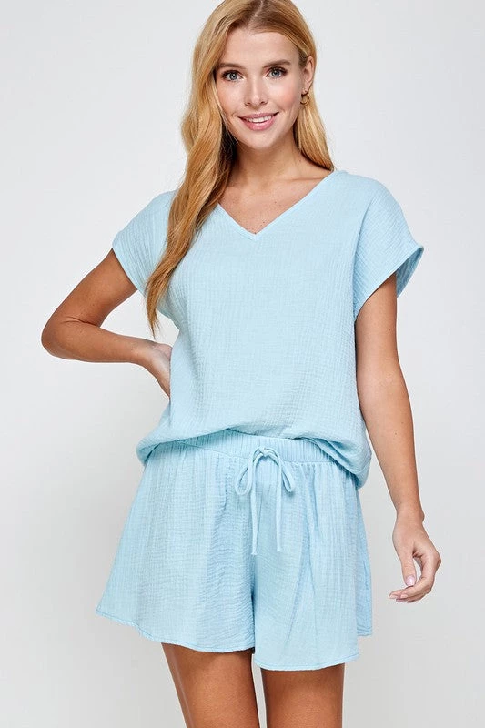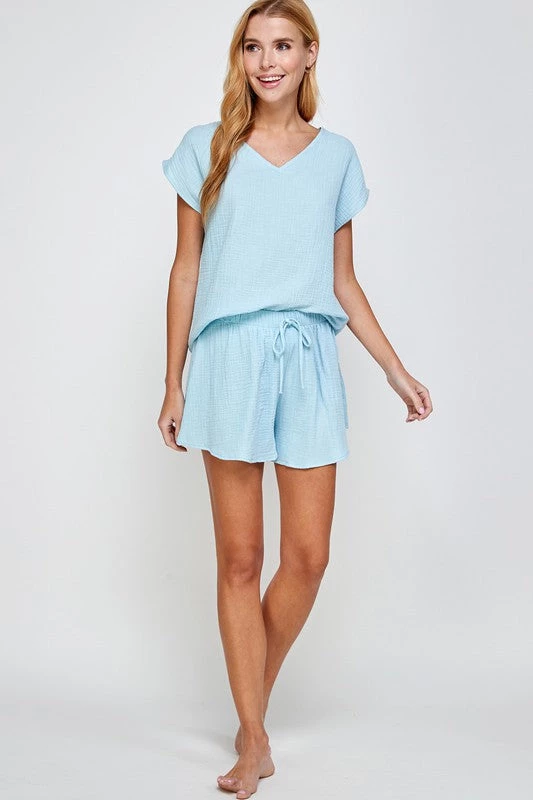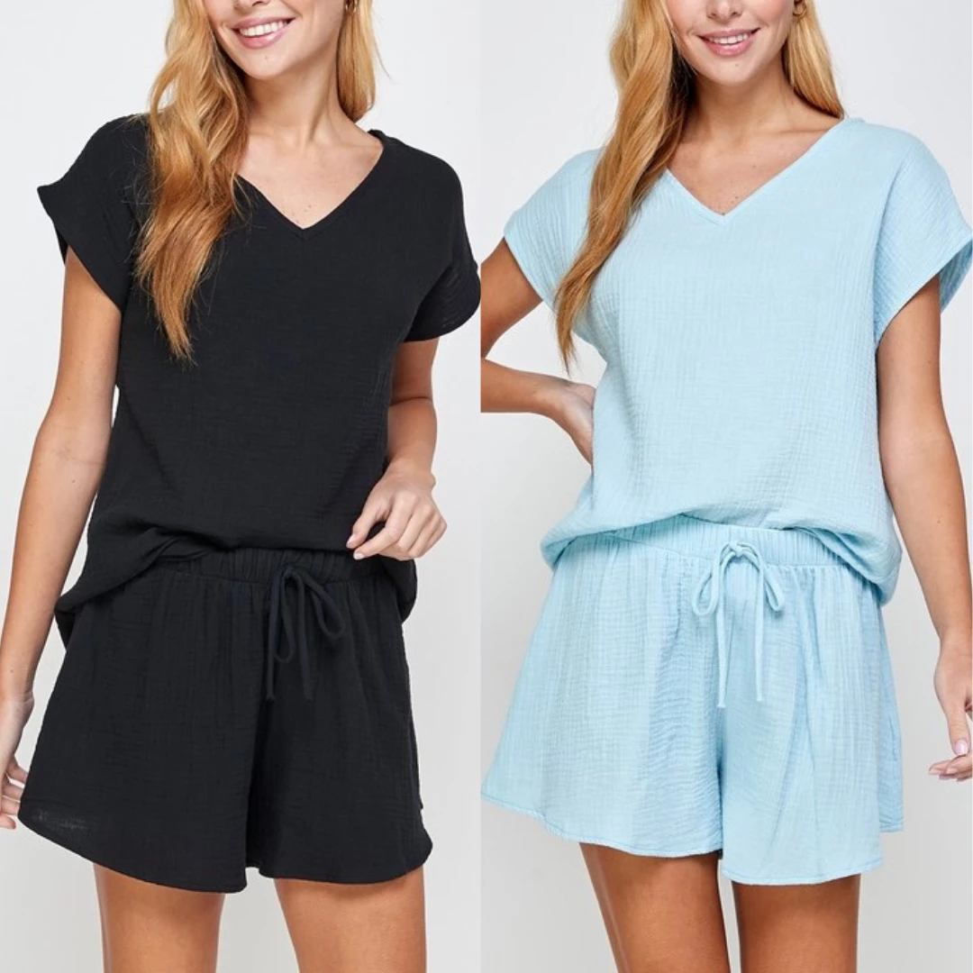 This is the perfect lounge set that can be worn in or out of the house. 100% Cotton in this breathable muslin fabric. V-neck with cap sleeves top. The shorts are high waisted with a drawstring and flowy for comfort. Comes in black or baby blue.