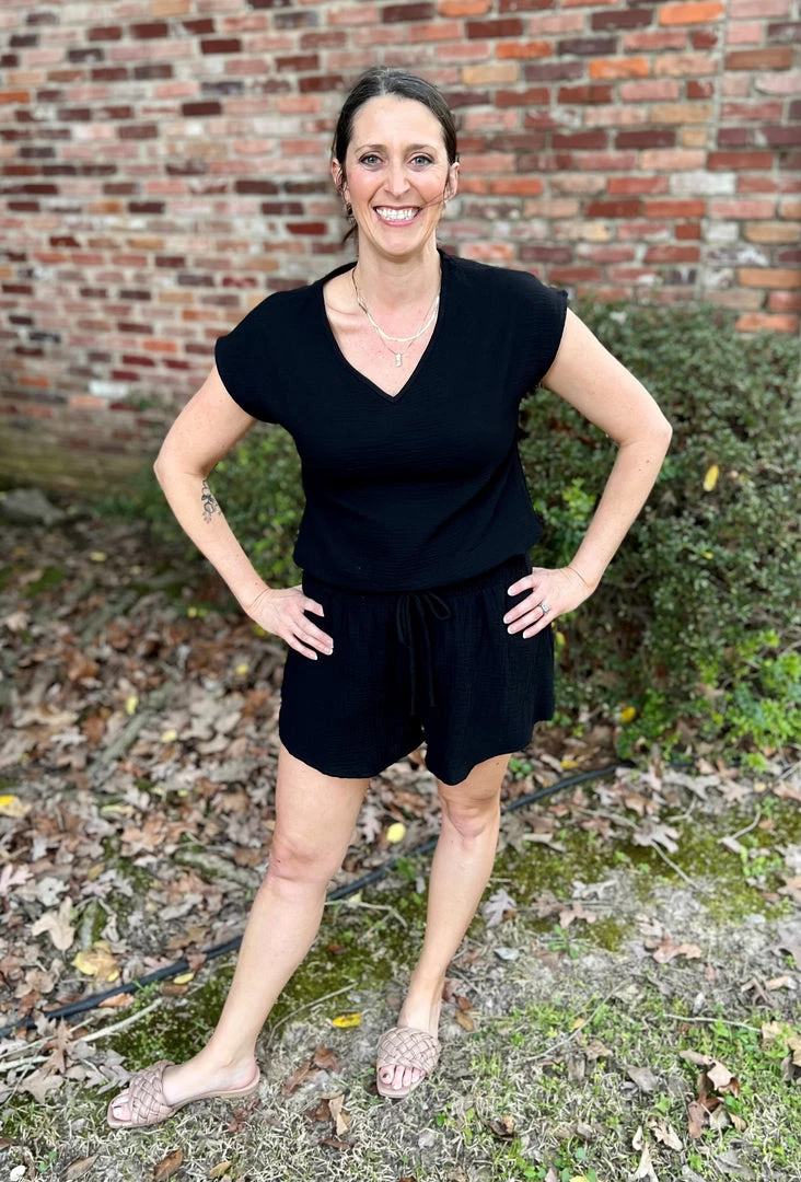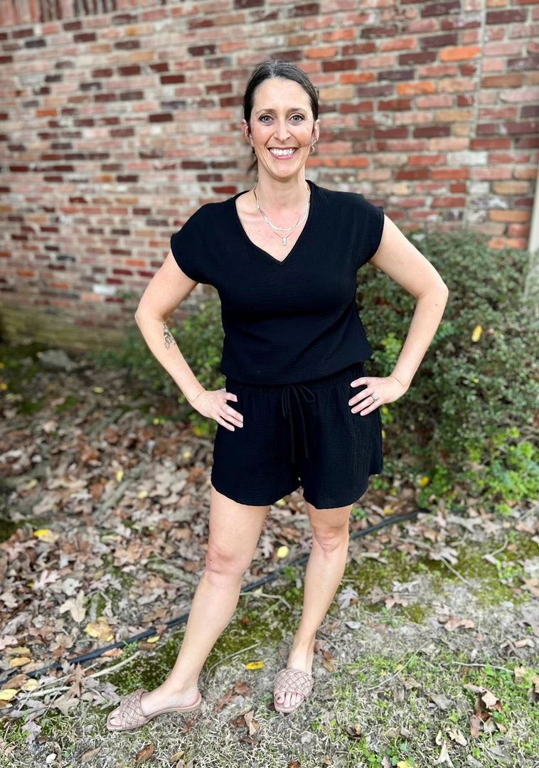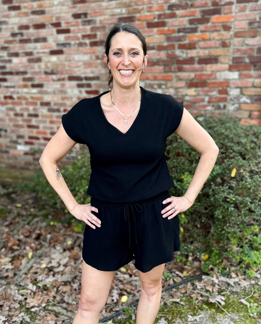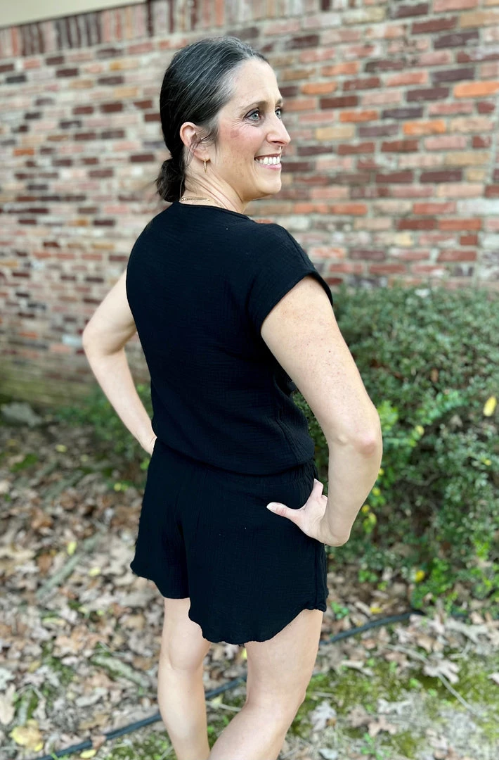 This is the perfect lounge set that can be worn in or out of the house. 100% Cotton in this breathable muslin fabric. V-neck with cap sleeves top. The shorts are high waisted with a drawstring and flowy for comfort. Comes in black or baby blue.