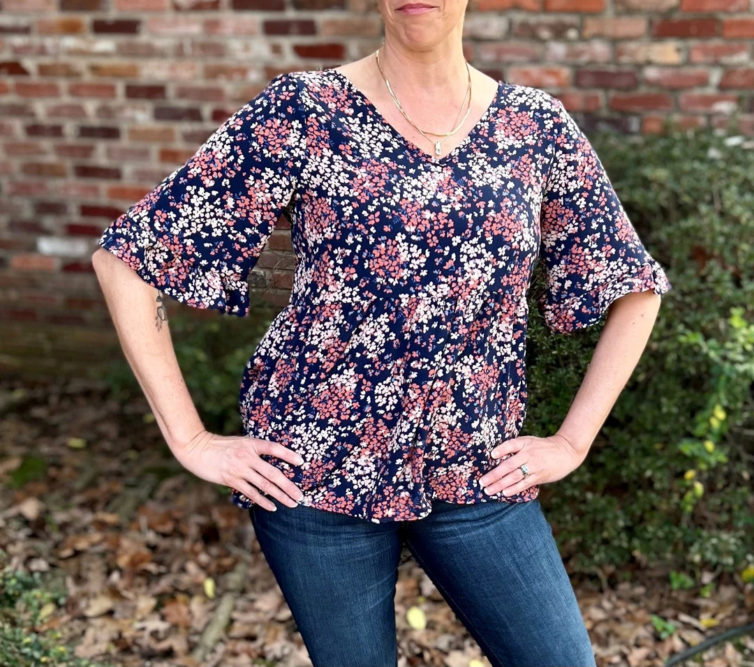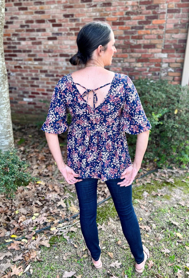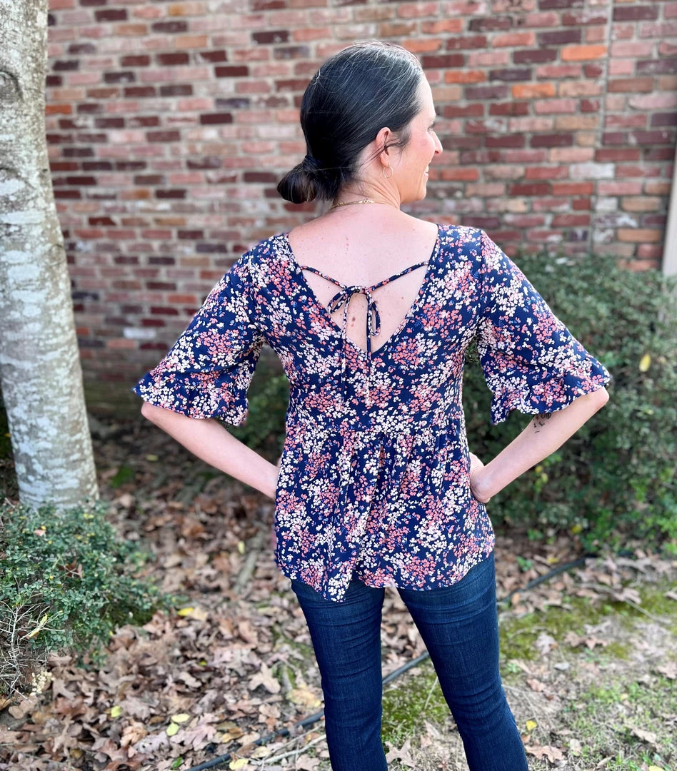 The baby doll shirt in on trend this season, and this one is a floral print V-neck in the front and back style. Adjustable back ties and shirring along the waistline. Ruffle trim detail on the half selleve. 100% Polyester