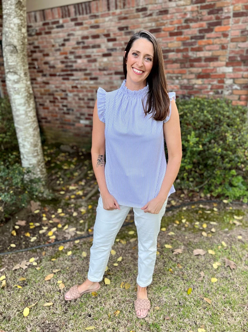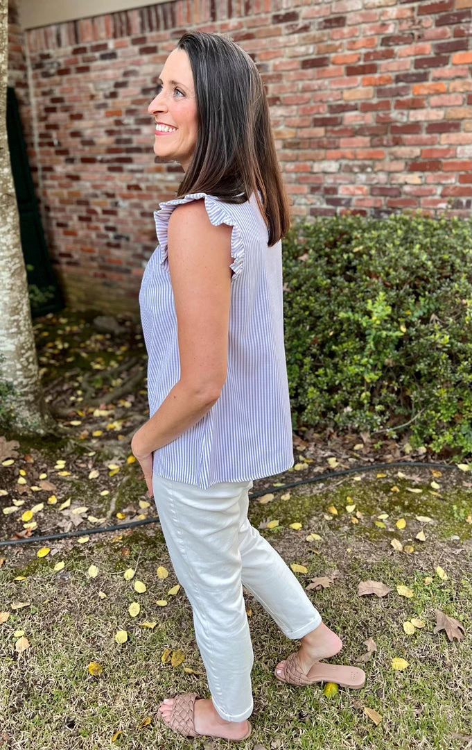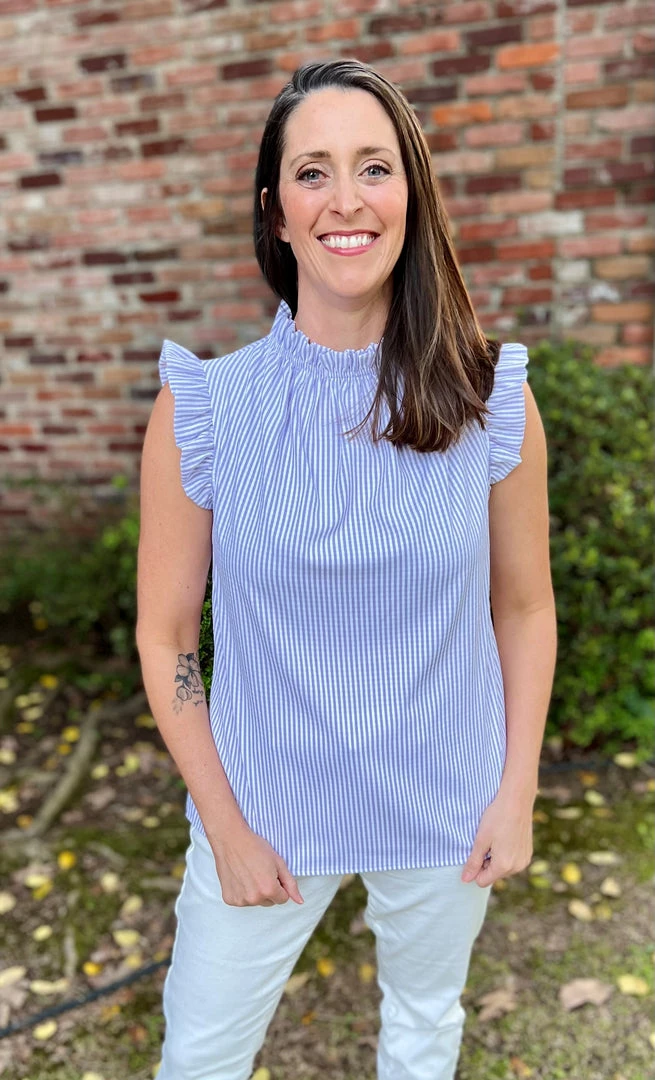 This top has a ruffled necklin and sleeves. Elastic in the neckline. Back button keyhole closure. Stripe is woven seer sucker fabric in a gorgeous lavender and white color. 100% Polyester, Brand is 2Hearts
