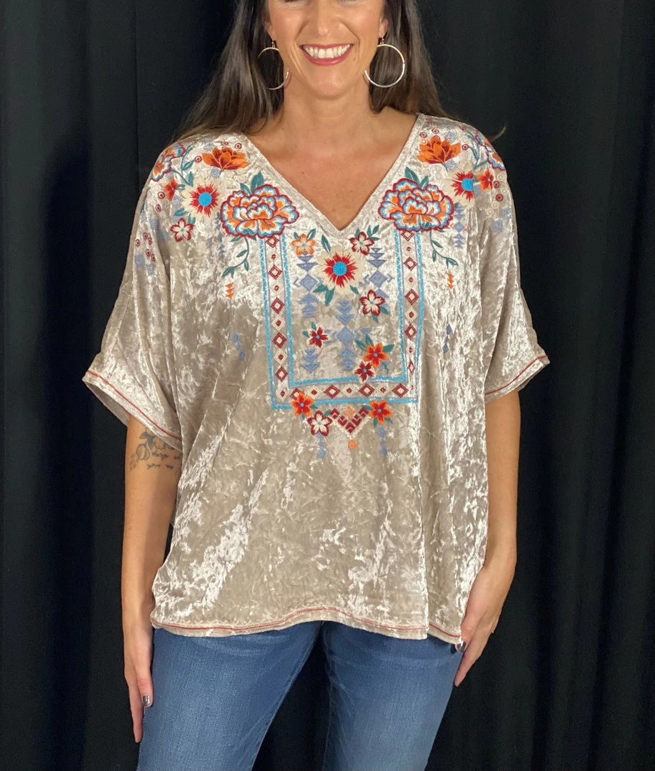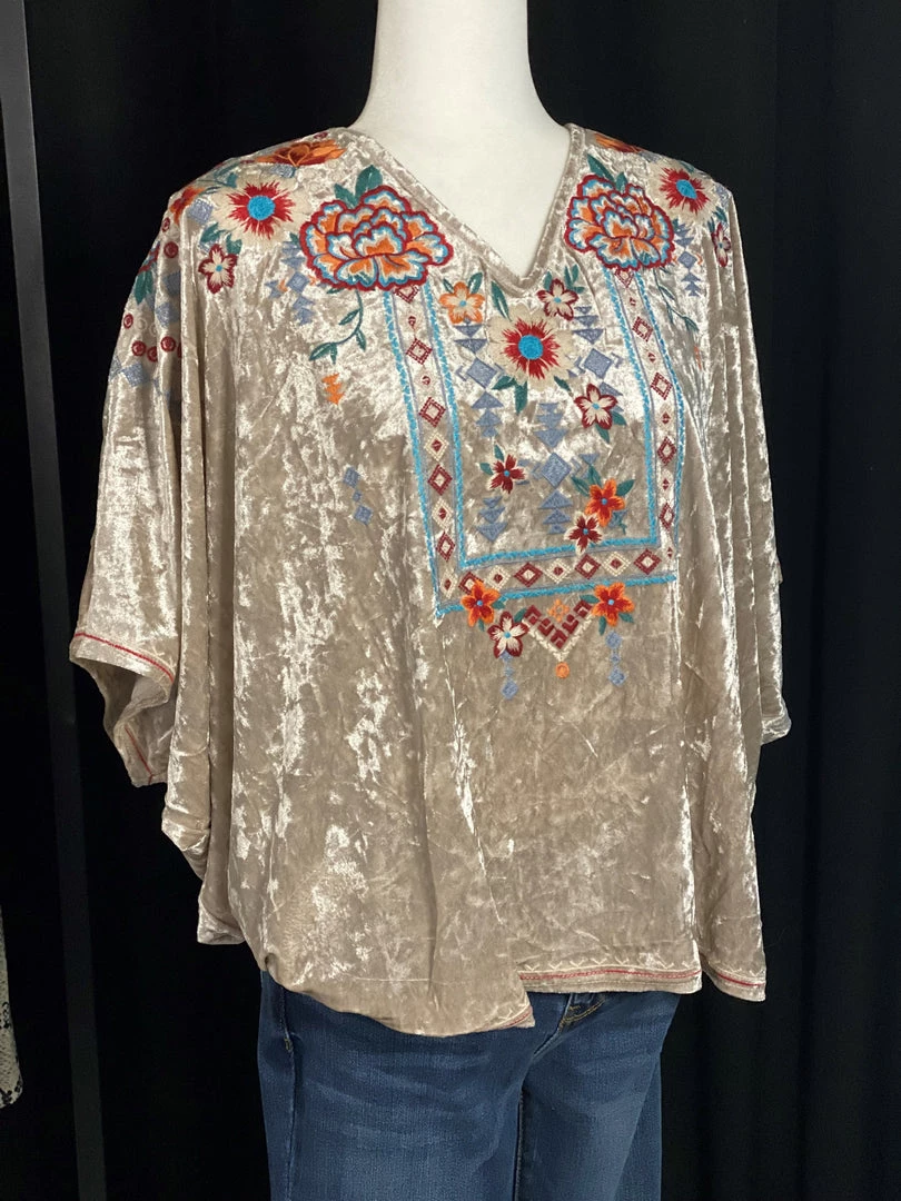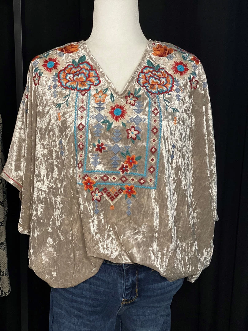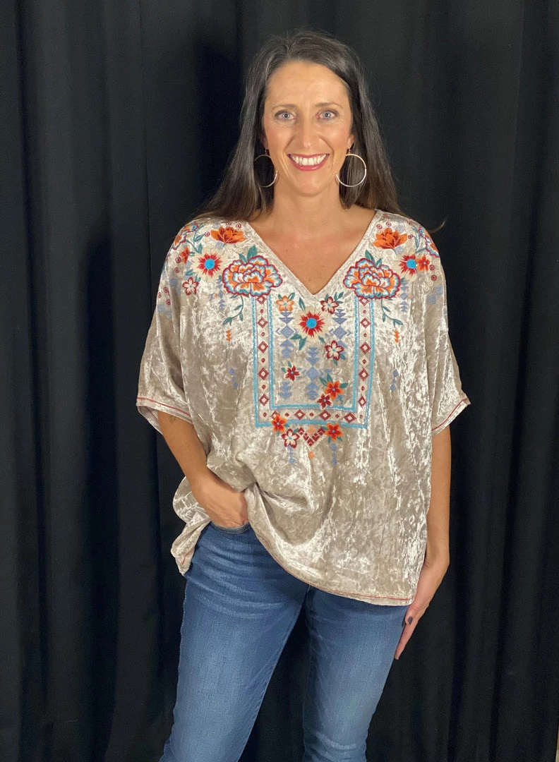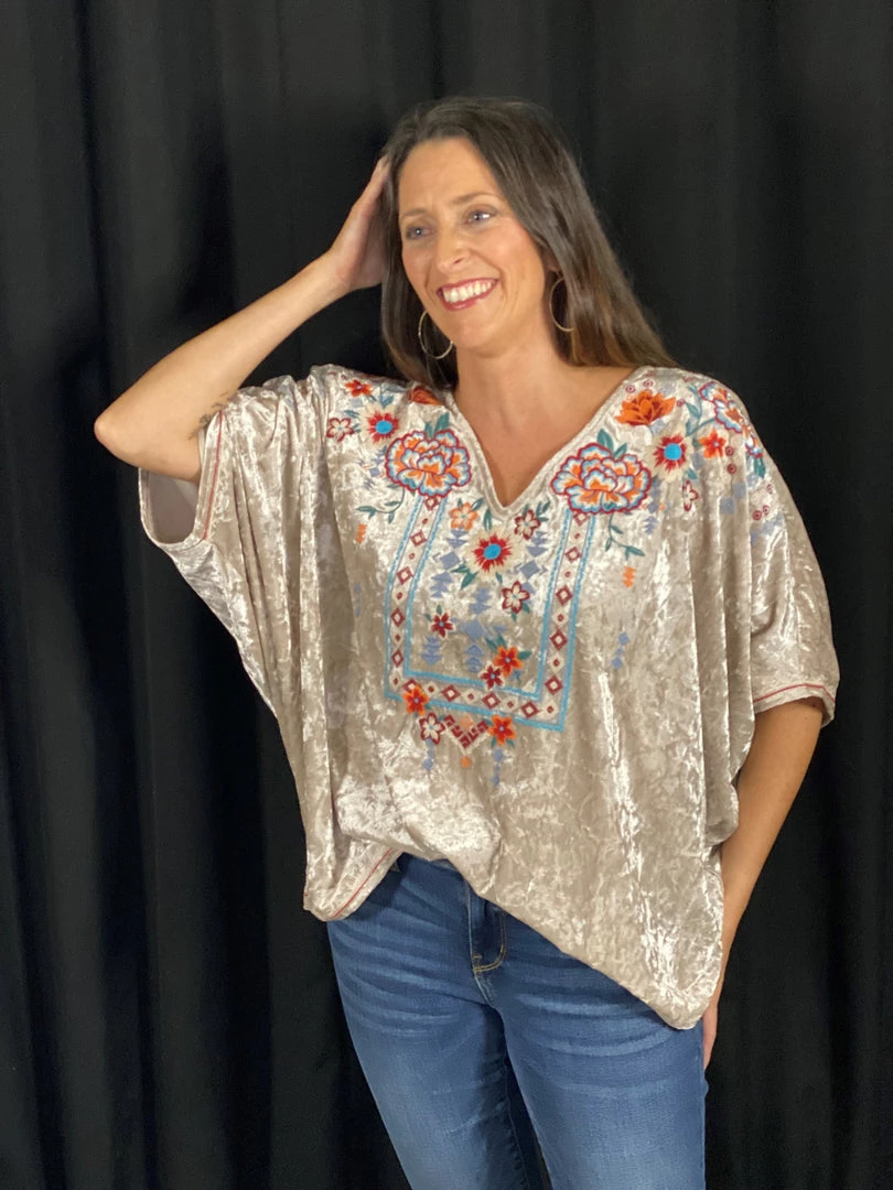 This velvet tunic top with v neckline and dolman sleeves is amazing! Embellished with embroidery all over the front, and with stretch, it is so easy to wear.Â