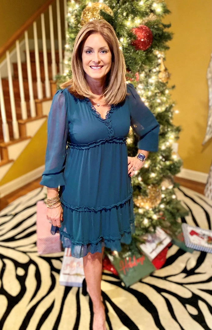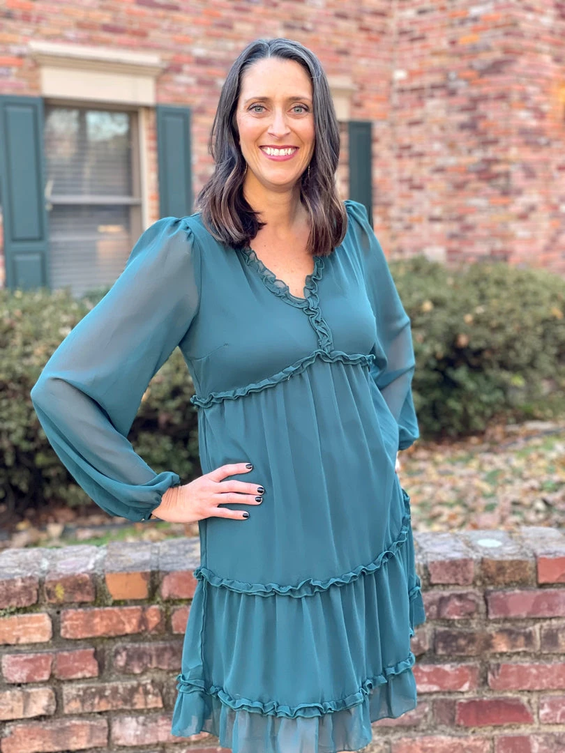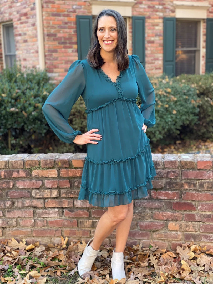 Hunter green babydoll dress with V neckline and balloon sleeves. We love the ruffle details throughout the dress. Zipper closure on back, body is fully lined, sleeves are sheer. 100% Polyester