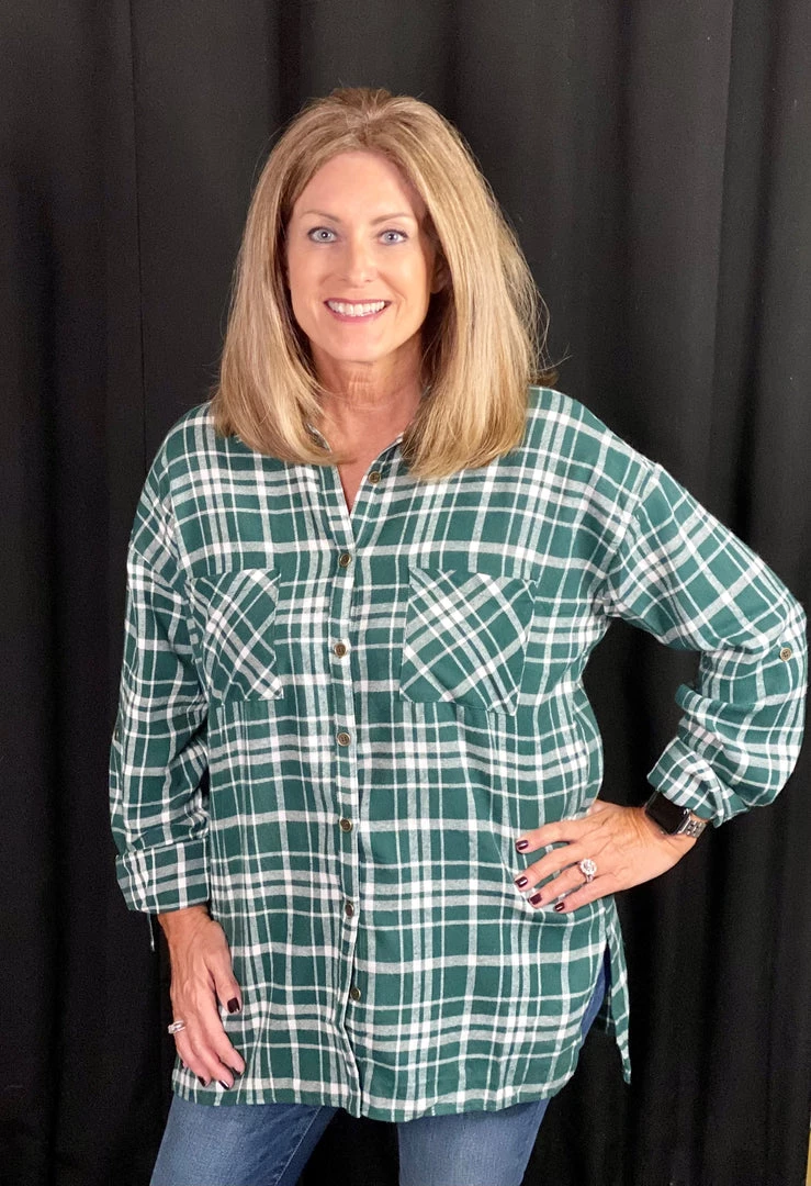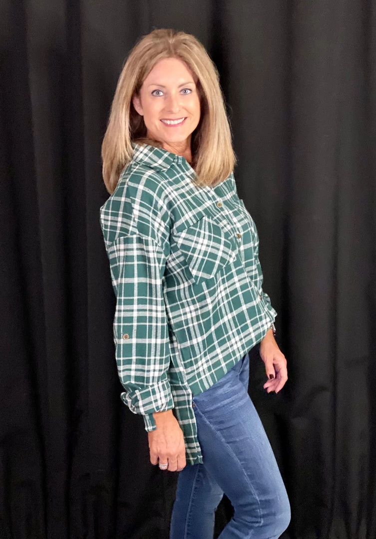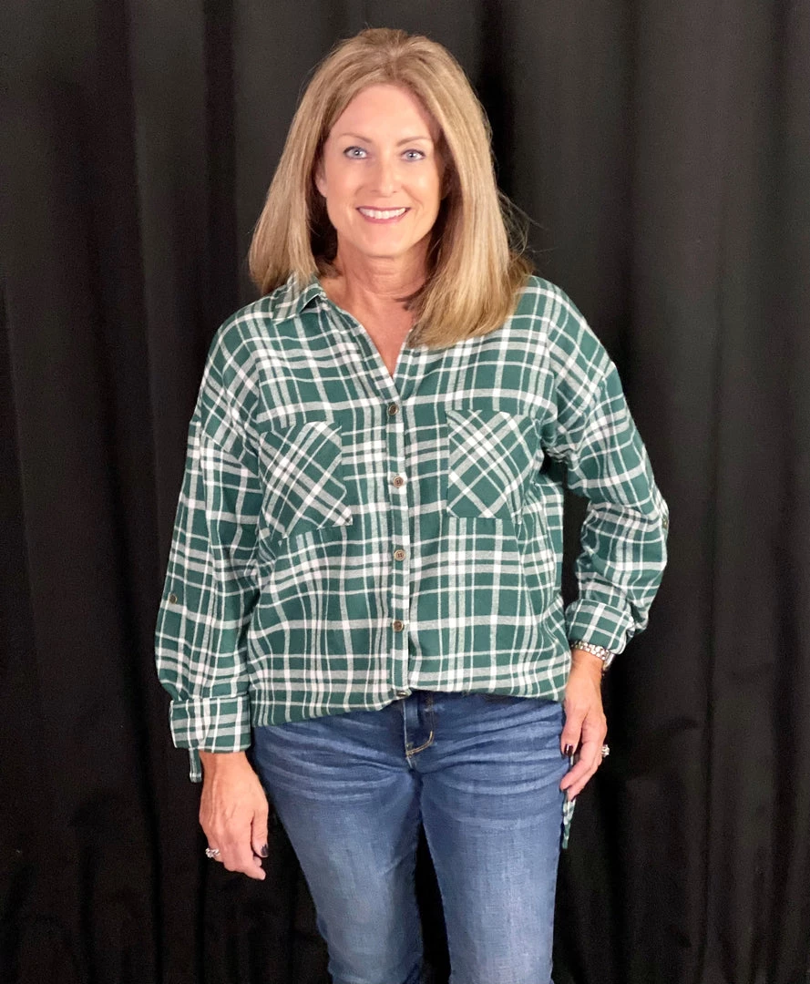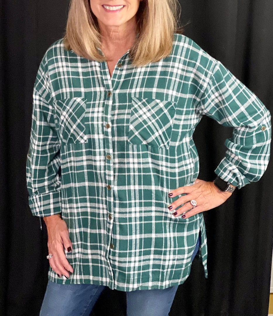 We are mad for plaid this season, and this rich hunter green plaid top is one of our favorites! Side slits make the fit excellent. Flannel, but not too thick.