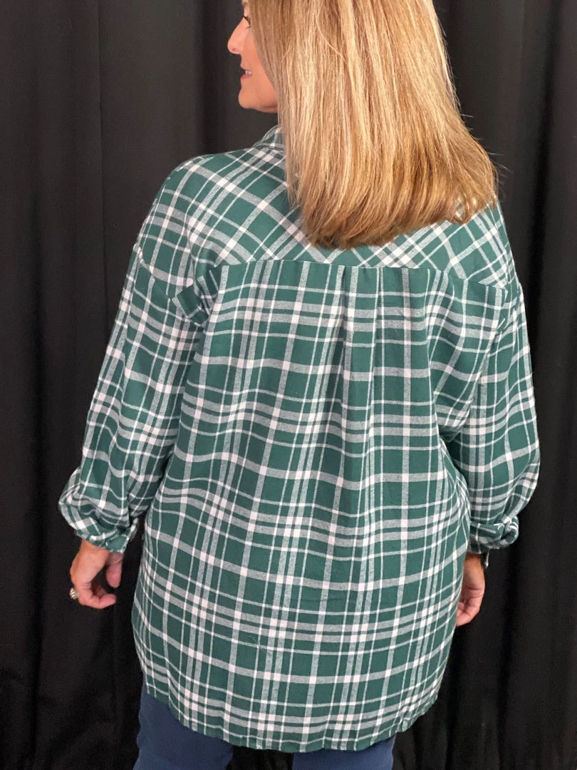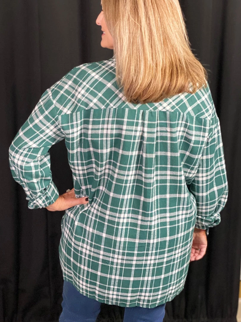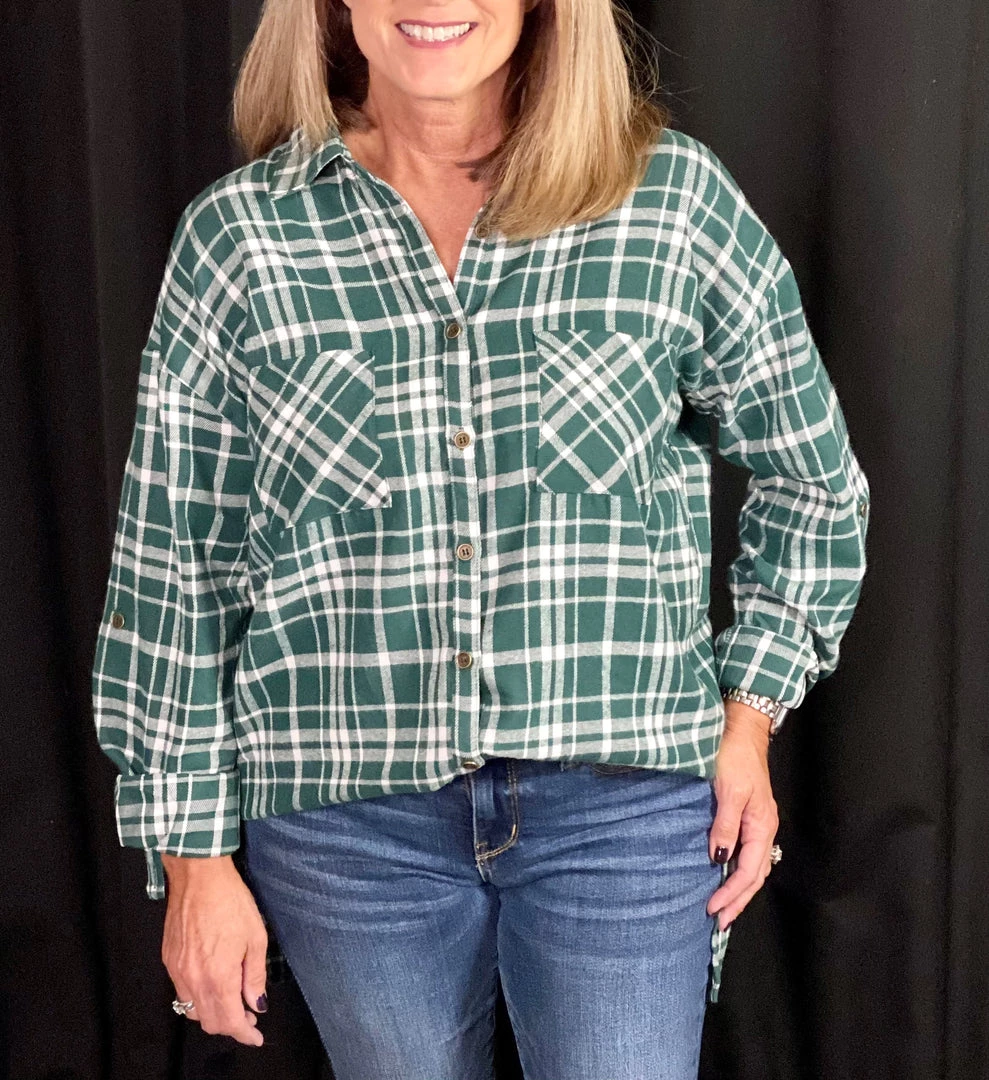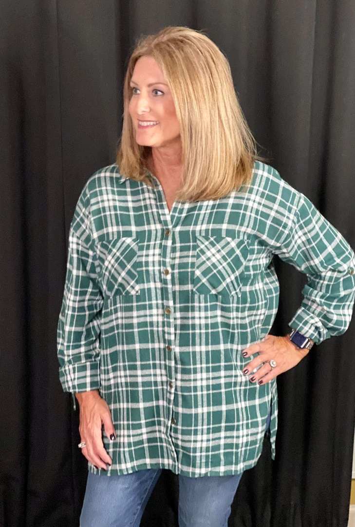 We are mad for plaid this season, and this rich hunter green plaid top is one of our favorites! Side slits make the fit excellent. Flannel, but not too thick.
