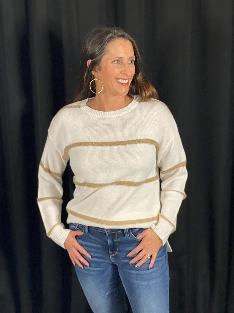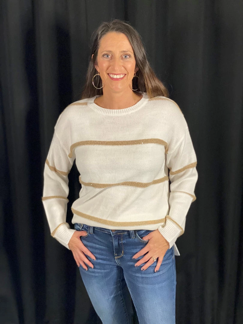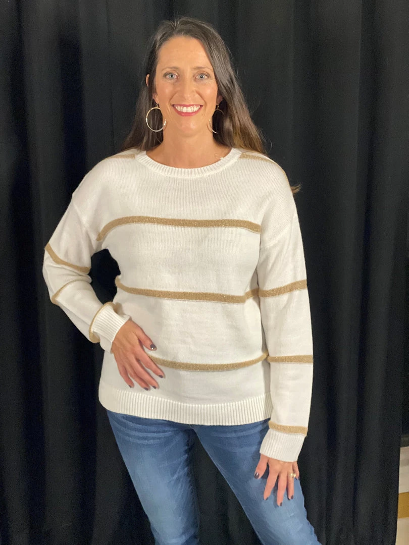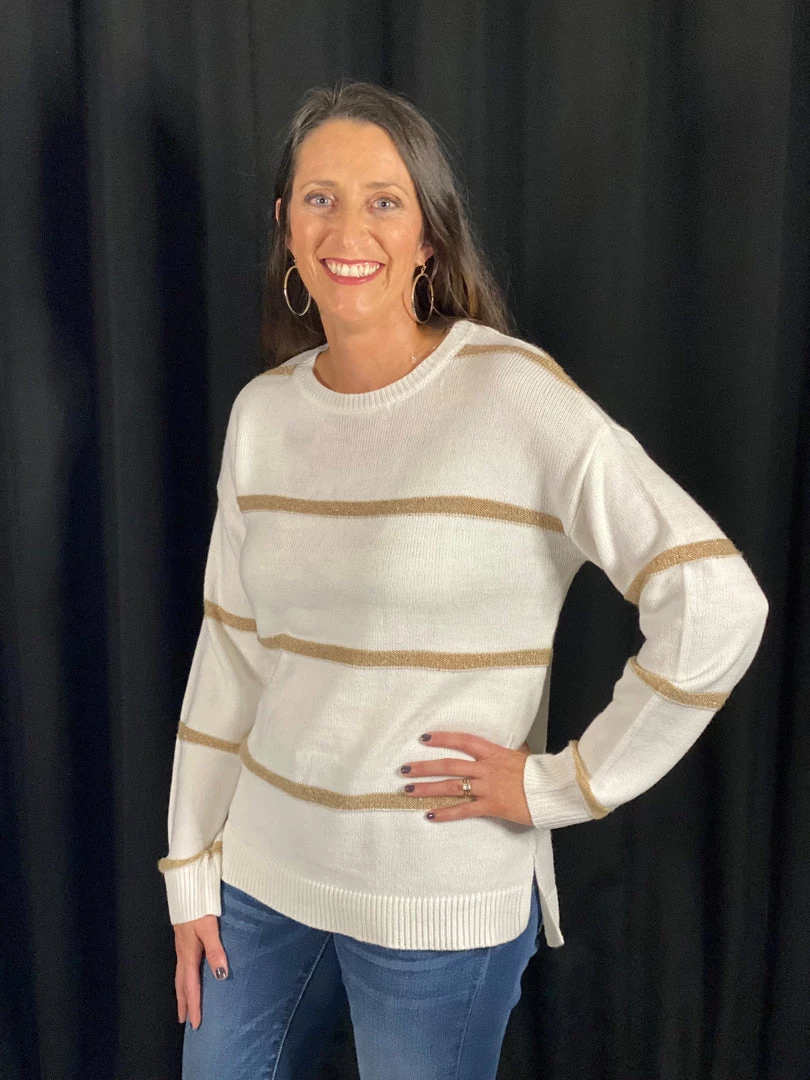 This Ivory Gold Sweater is so soft and light weight. The gold lame’ thread in the thin stripes add a subtle accent to make this sweater pop! It is made of 90% Acrylic and 10% Polyester it has a ribbed hemline and sleeves. Easy fit, soft, non-itchy!