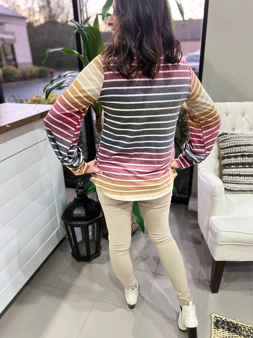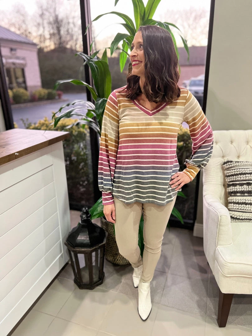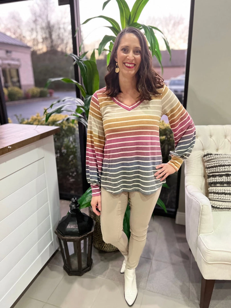 Brighten up any day with this fun, easy pull-over top! Stripe fabric that is so soft, V-neck, and a slight puff sleeve at the wrist.