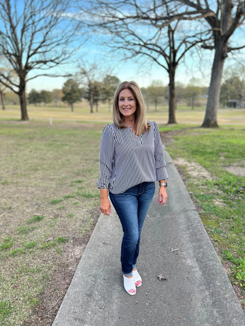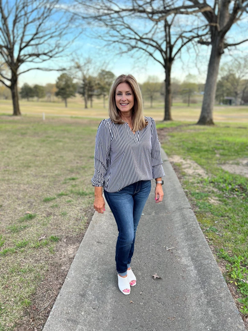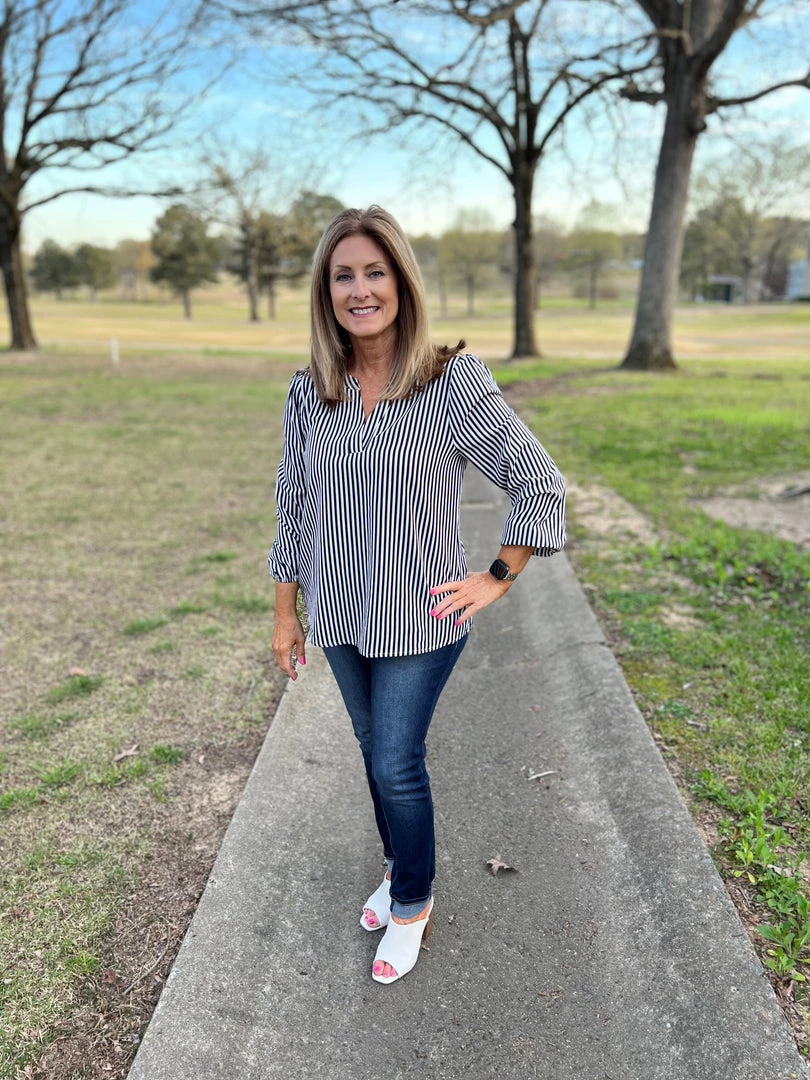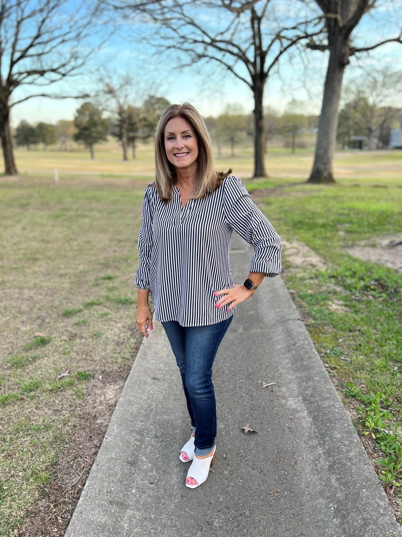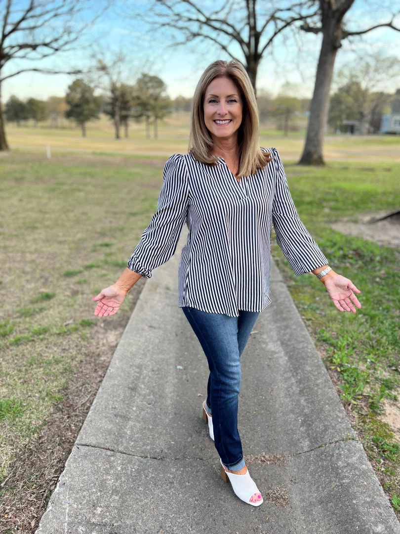 This classic black and white blouse has long sleeves with a classy fit and striped fabrication .V-neck and elastic at the wrists. Lightweight, non sheer, woven. 100% Polyester. Brand is Andree by Unit