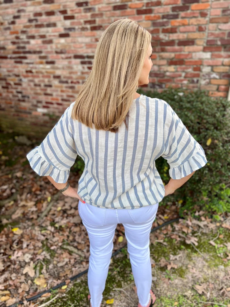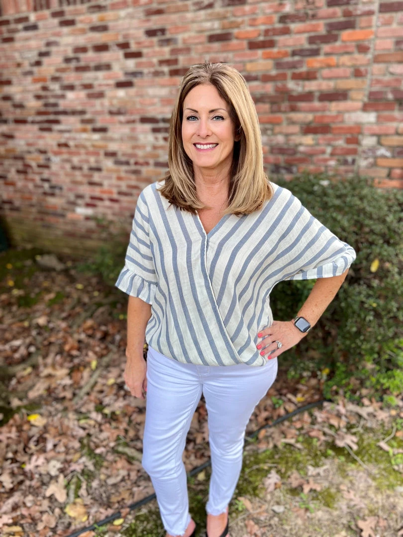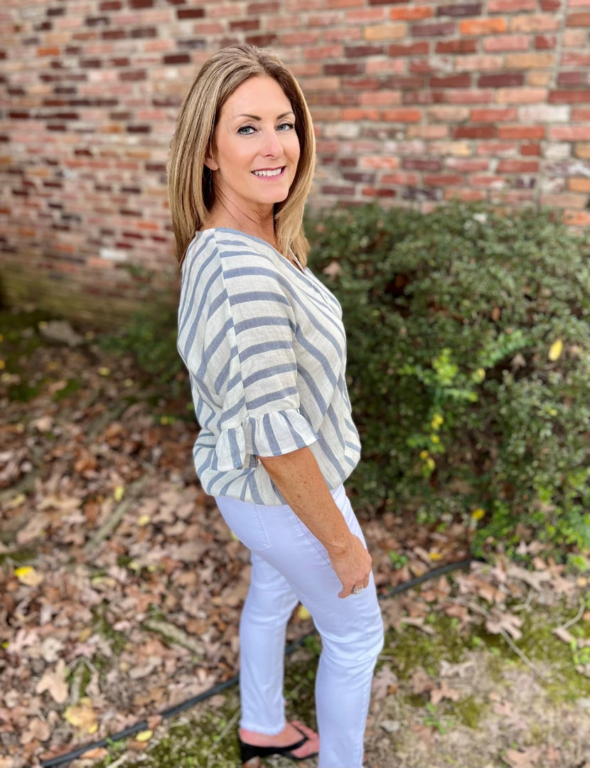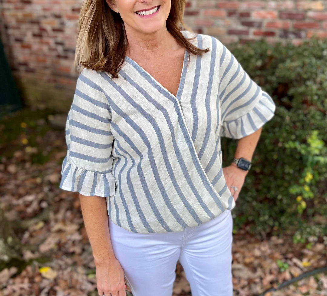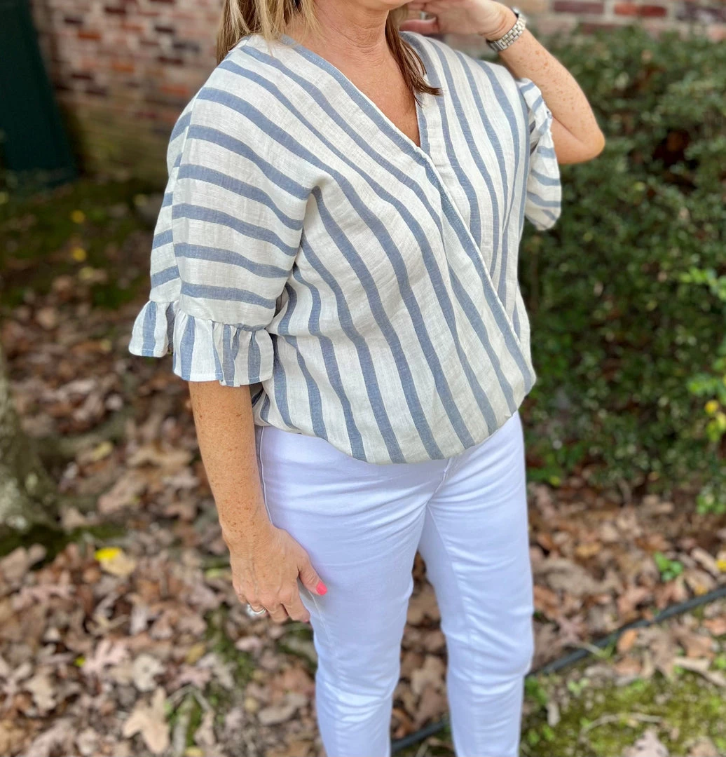 Striped surplice woven top with 3/4 length sleeves and elastic hemline. The ruffle on the sleeve gives it a feminine looks. We love the look of the blue and ivory color and the feel on this 100% cotton fabric.