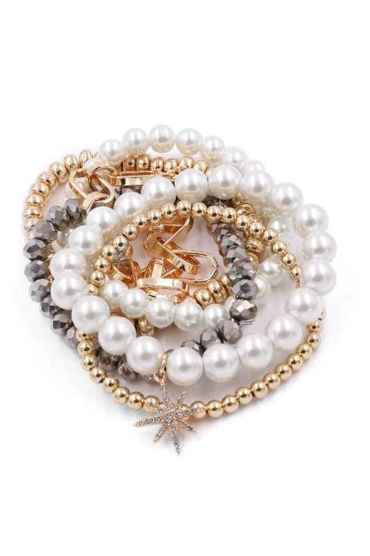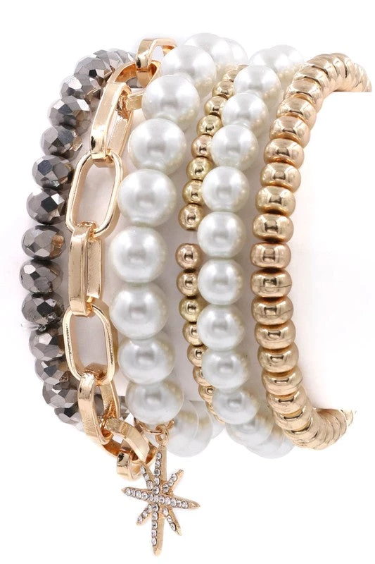 Metal chain with cream and pearl assorted beaded bracelet set with six elastic strands. Wear alone as is or mix and match with other stacks for a unique look.
