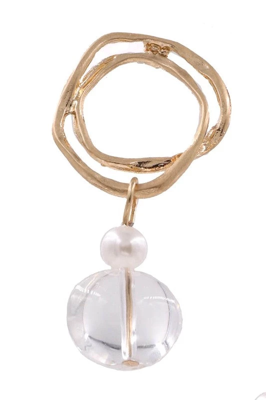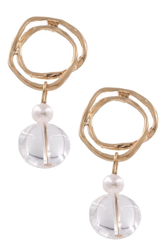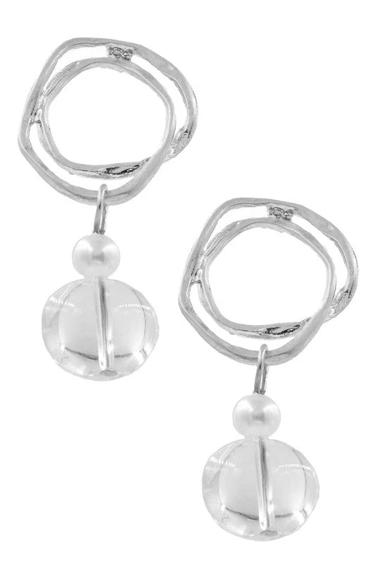 What a trendy yet classic look on these earrings! In gold or silver muted metal, the double circle and glass jewel drop are the perfect combo. Earring length is 1 3/4″ long. Post back.