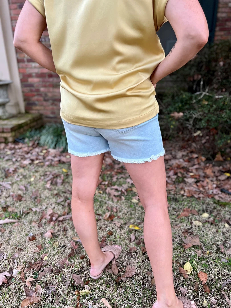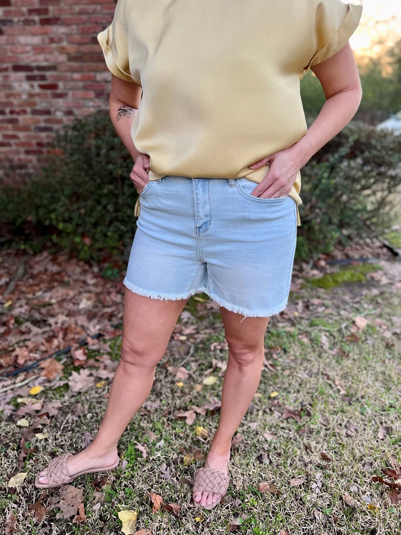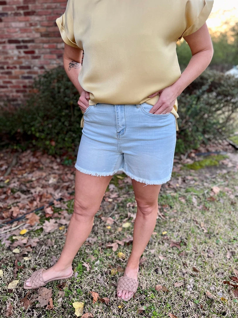 Hight waist light wash Judy Blue shorts have a touch of fraying on the hemline. 4.5″ inseam and a 10.5″ rise.  92% Cotton / 7% Polyester / 1% Spandex