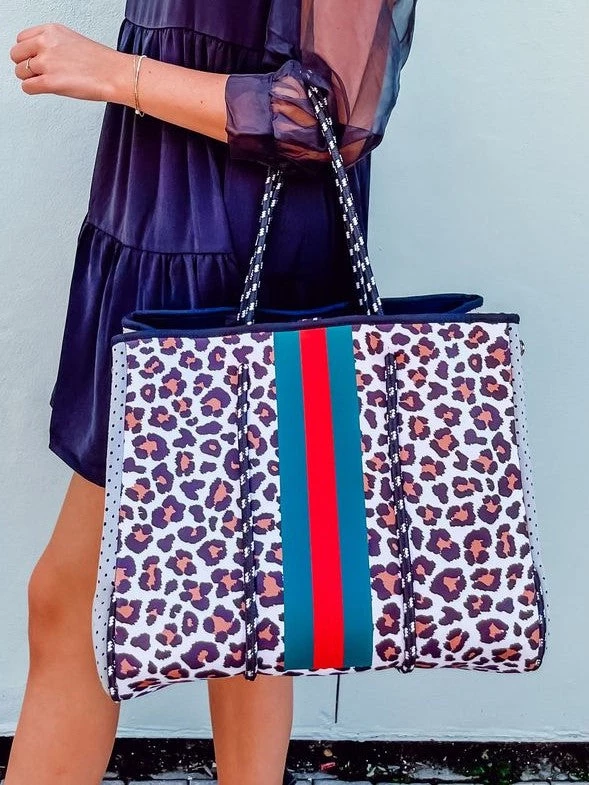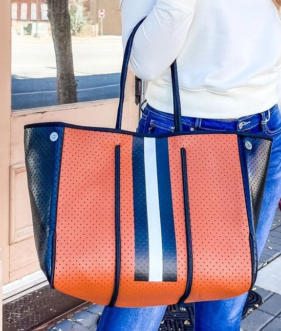The neoprene totes are so popular and trendy this year, and sure to be on everyone’s list! Lightweight yet durable neoprene material with rope accents and handles. Comes with a removable zippered pouch. Magnetic closures on both sides of the bag to bring in the sides if you prefer to have a more tapered look. Top magnetic closure and removable hard liner at the bottom of the bag. Makes the perfect handbag, computer bag, or beach bag.