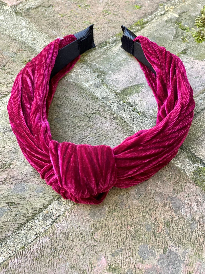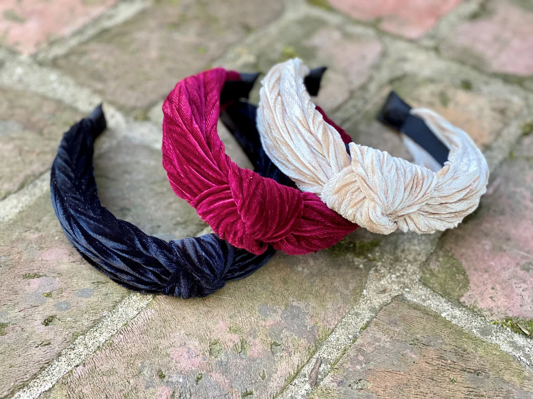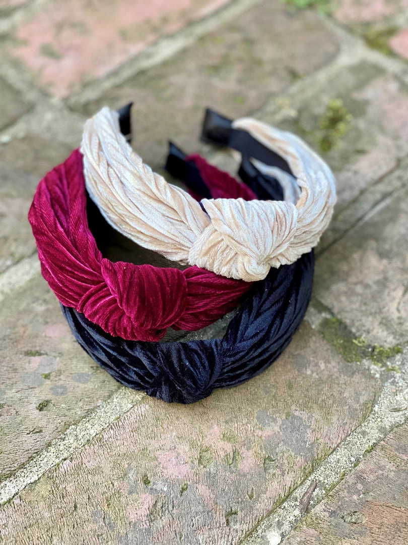 This textured velvet headband is perfect for Holiday celebrations. It has an accent top knot and a satin feel interior. The ends are fabric wrapped for comfortability behind the ears.