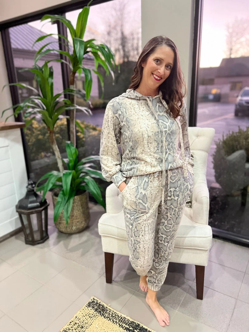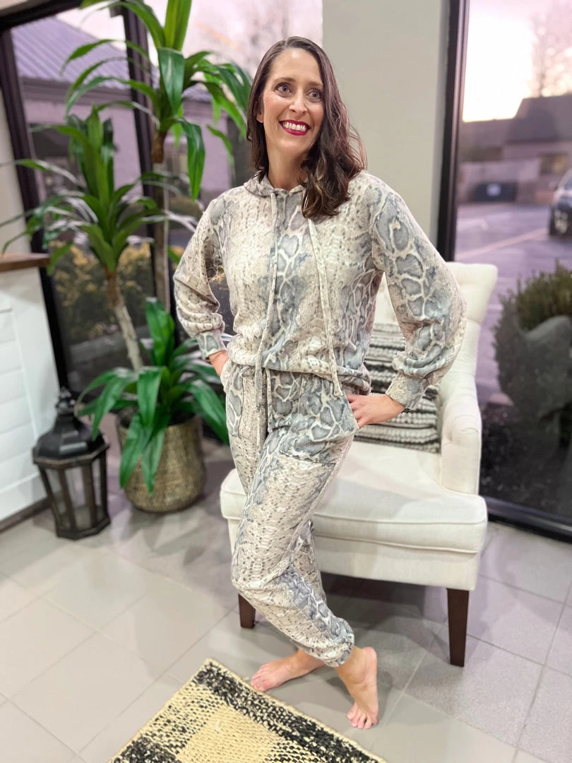 The Brushed Snake Skin  Joggers have and elastic waist band with a functional draw string. Relaxed f it Drawstring Waist with pockets. Wear this comfy lounge set anywhere. 68% Polyester, 29% Rayon, 3% Spandex