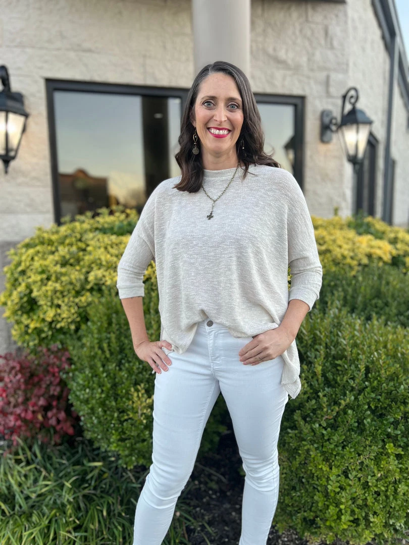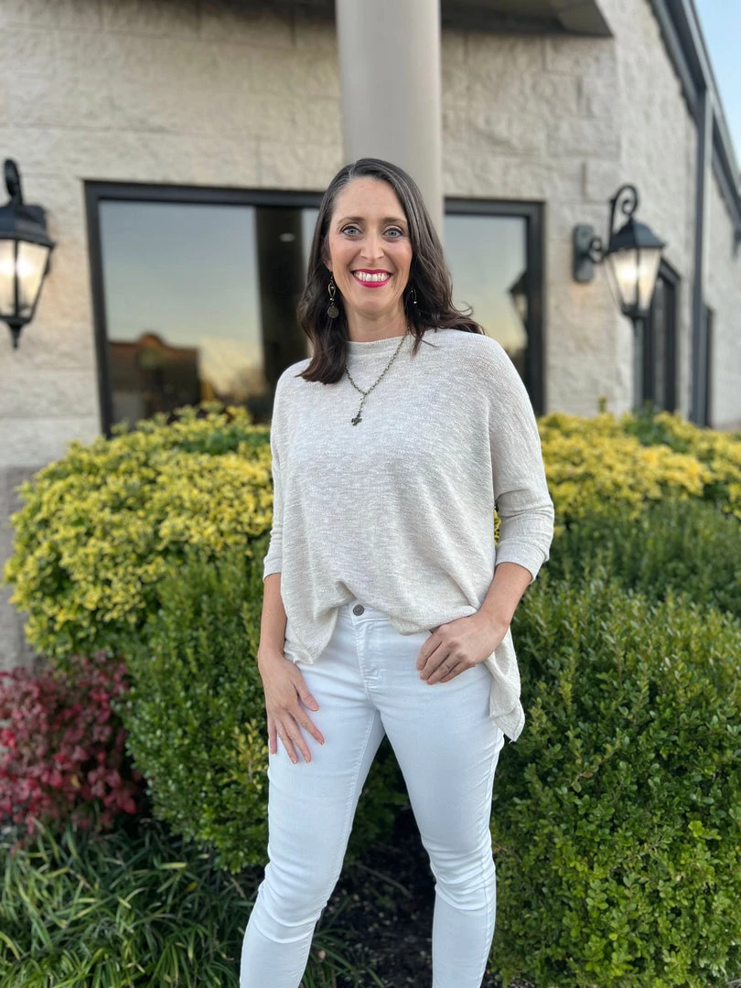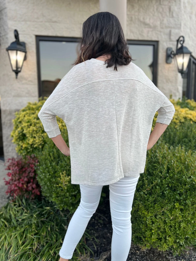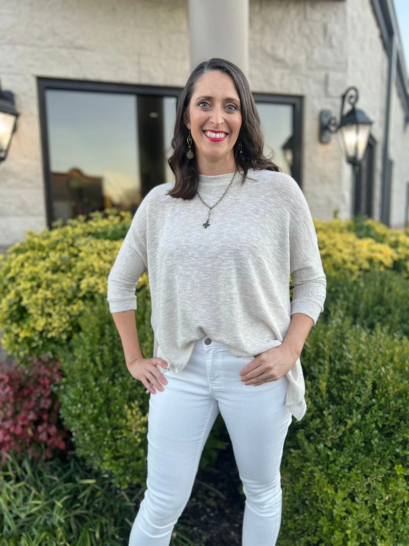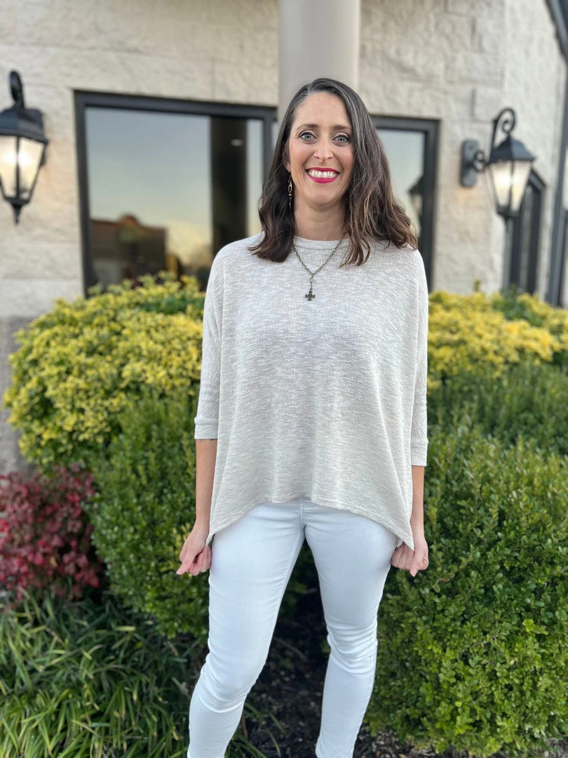 This boxy top will go with everything! Dolman sleeves, high low with a loose fit and a rounded neck line. Three quarter dolman sleeves. 68% Polyester 28% Rayon 4% Spandex