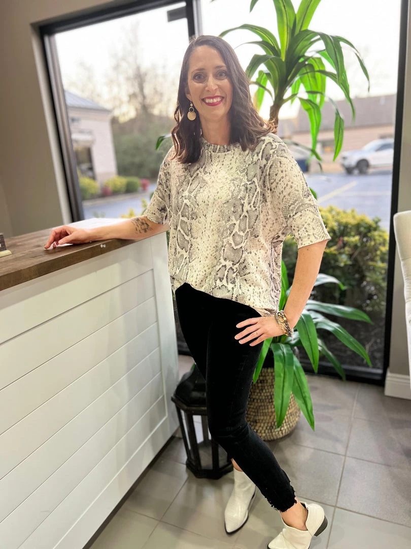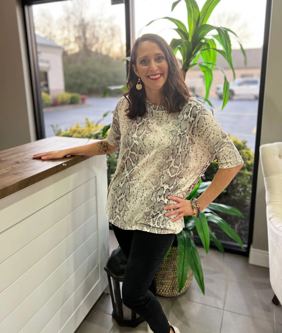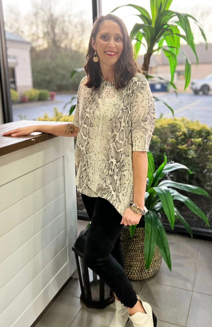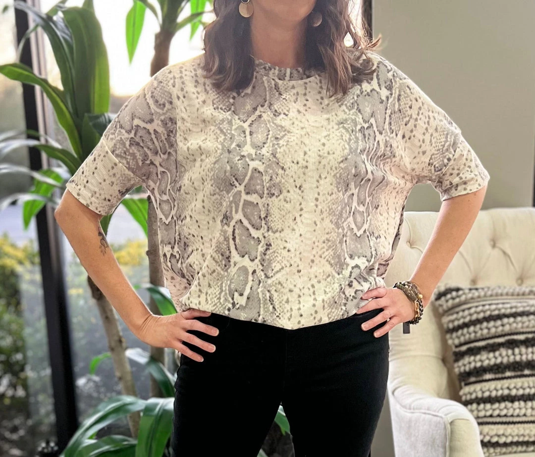 Look at this one! Snake Skin Thermal Top with a round boat neck and half sleeves. Lose fit. The perfect weight for year around. Pair with a pair of white jeans or shorts in the hotter months. 80% Polyester 15% Rayon 5% Spandex