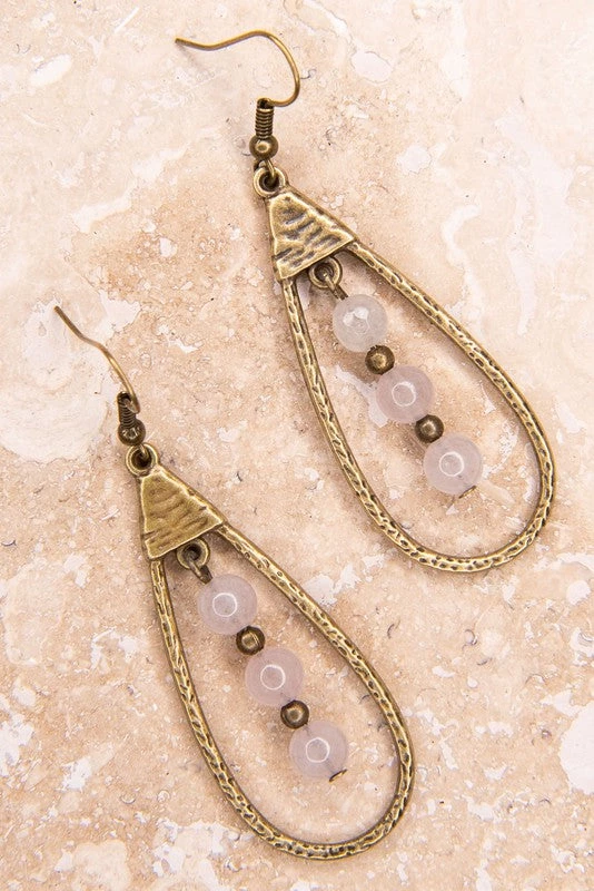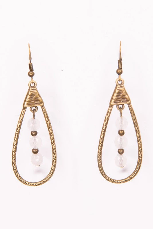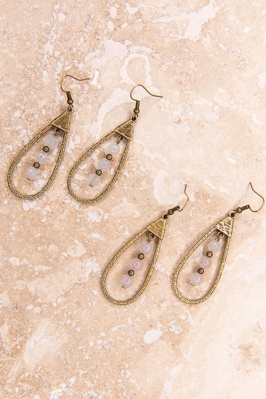 You know we love our signature earrings each year and we picked this style for 2022! Antique bronze teardrop shape earrings with a fish hook and dangle with quartz and bronze beads in the center. 2″ length from the top of the fish hook. Â
