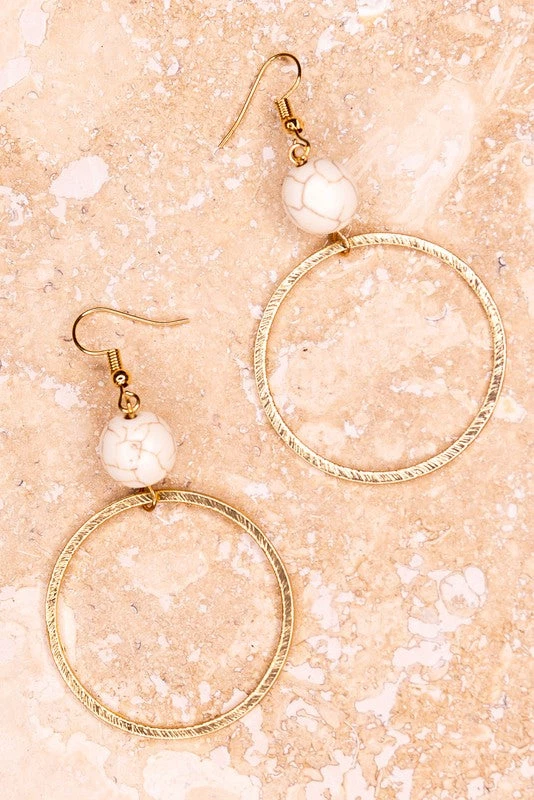 These dangle and drop fishhook earrings are a simple statement. They have a natural stone ivory bead with a gold hoop that drops below it. Lightweight. Length: 2.5″
