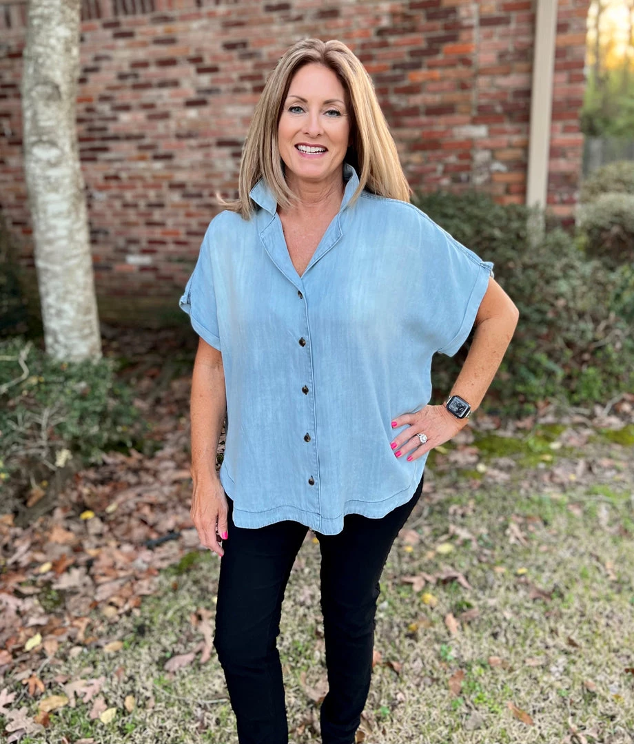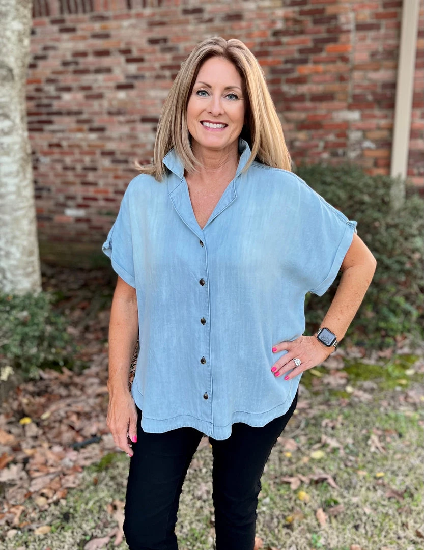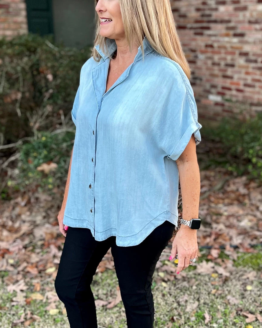 Such a great top! This loose fit washed denim shirt has rooled up sleeves and a lapel collar,. The fit is a loose and boxy silhouette that is so flattering. Curved bottom hem. 100% Tencel