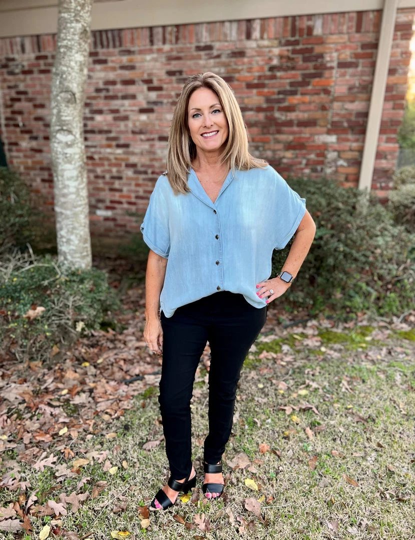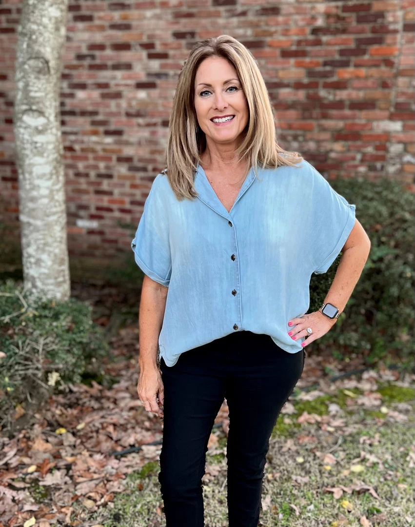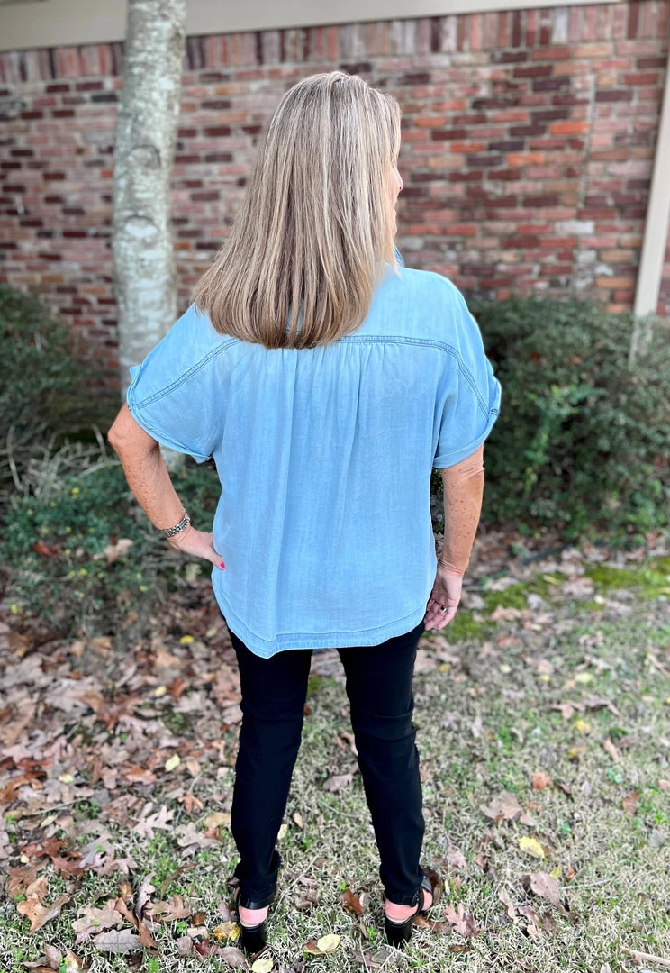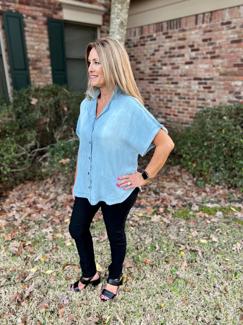 Such a great top! This loose fit washed denim shirt has rooled up sleeves and a lapel collar,. The fit is a loose and boxy silhouette that is so flattering. Curved bottom hem. 100% Tencel