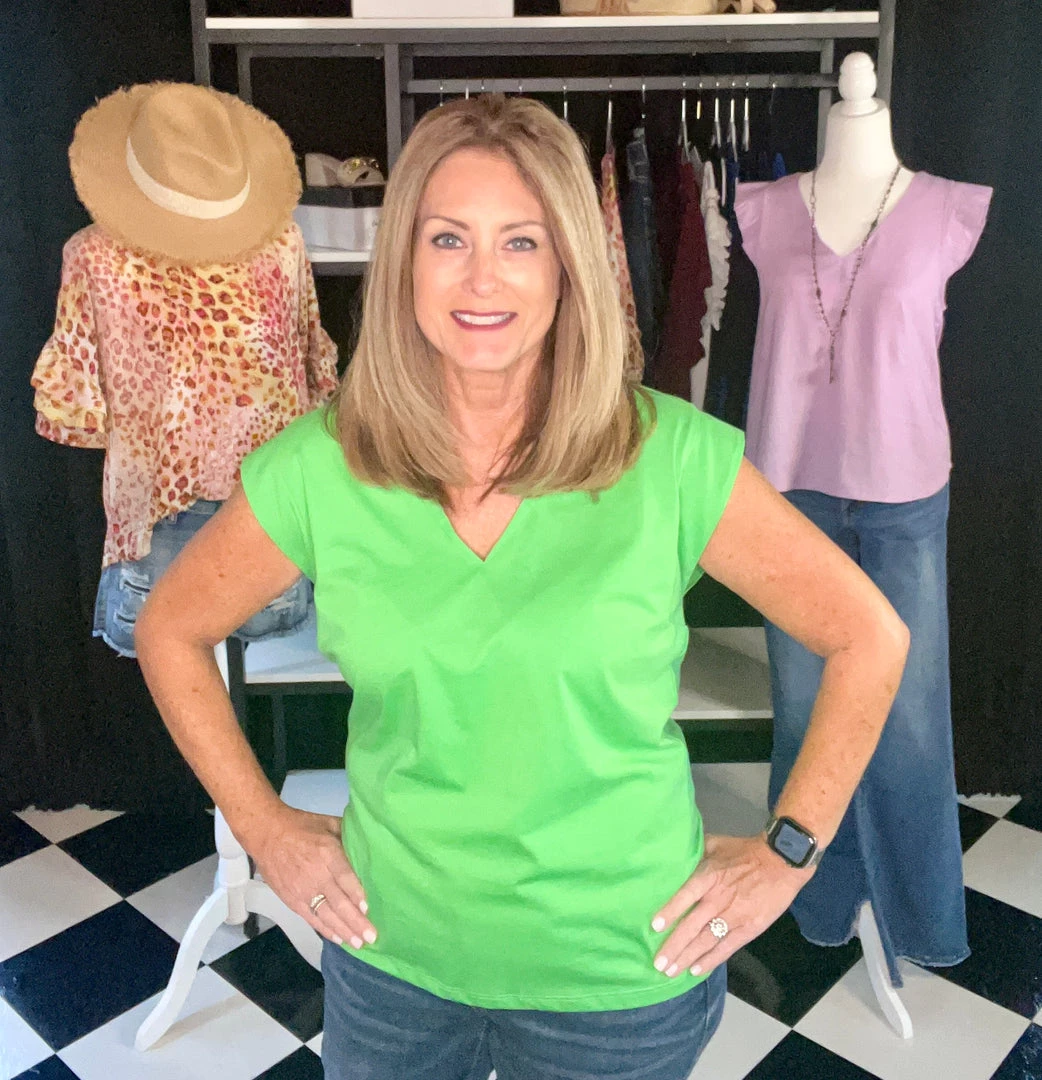 Cap sleeve V-neck top with a classic look. The vivid solid color is perfect for Summer. Relaxed silhouette ensures comfort and a great fit,