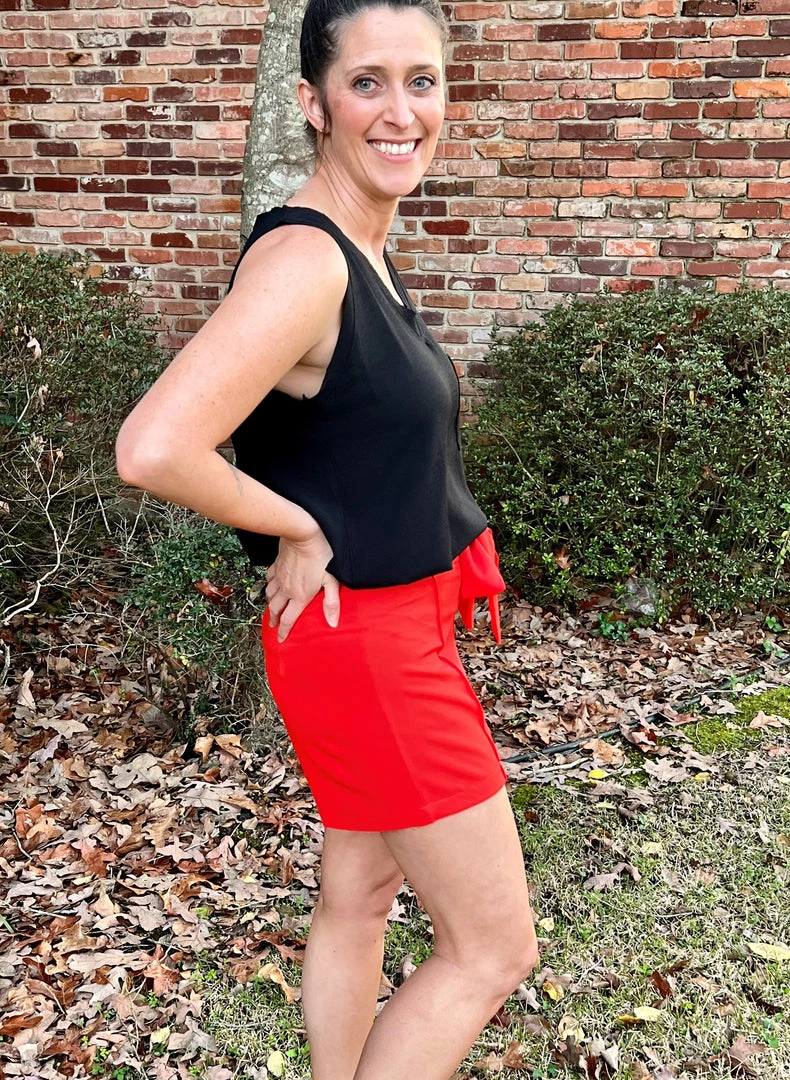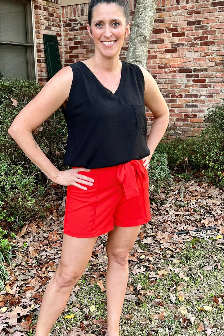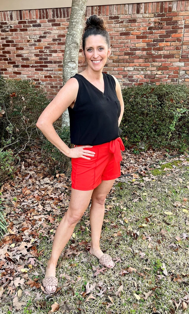 Love these fabulous tie front shorts in a gorgeous tomato color. High rise shorts with pleating detail. These shorts will definitely level up your look! 100% Polyester. Brand is Ellison.