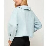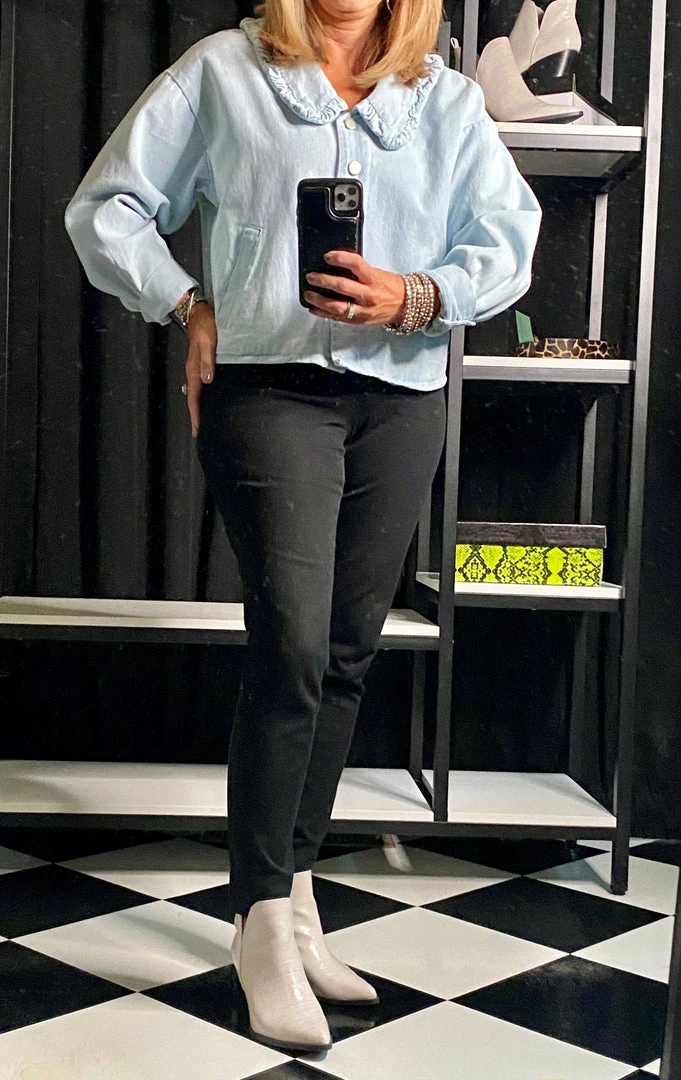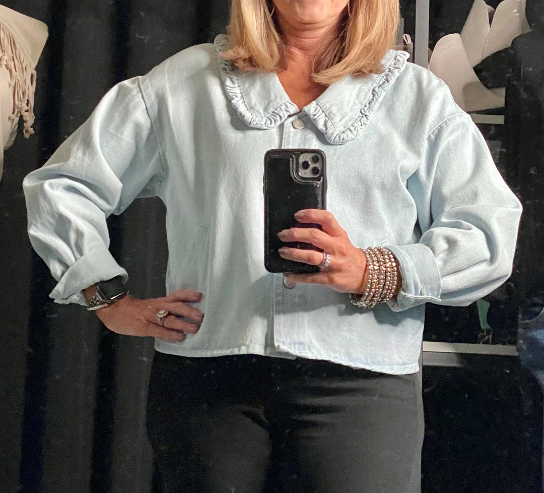 How precious is this jacket? Light washed denim featuring a relaxed silhouette and a V-neckline. Button down closure and pointed collar with ruffle detailing. Side pockets are a definite bonus!