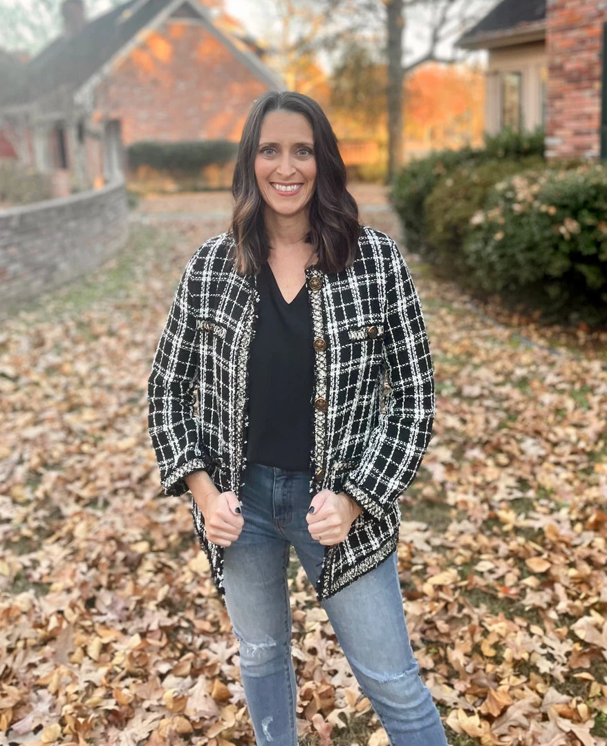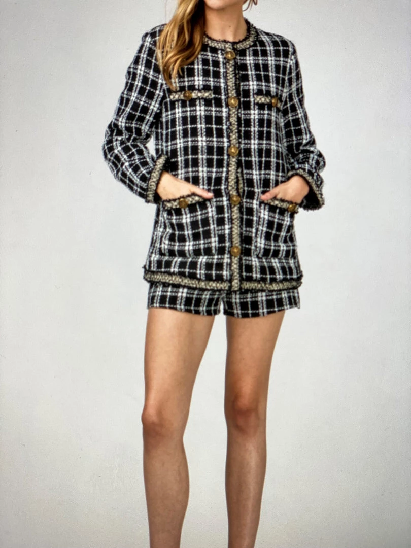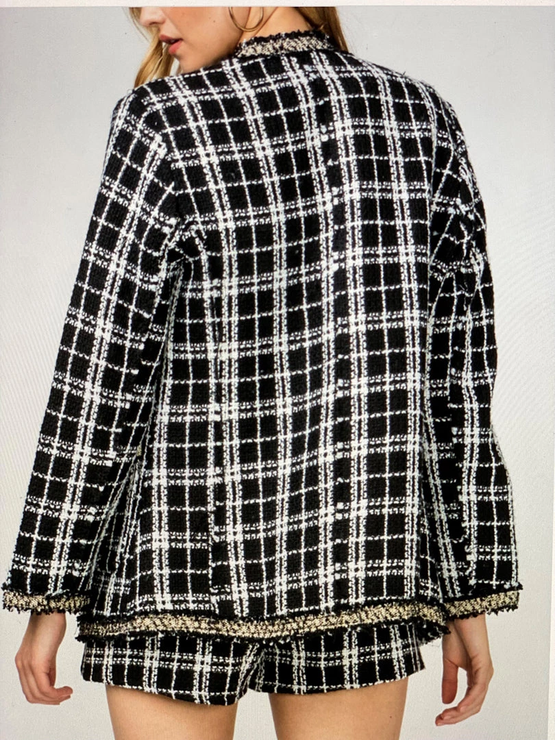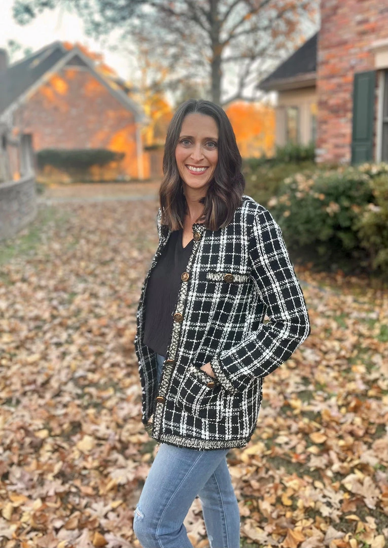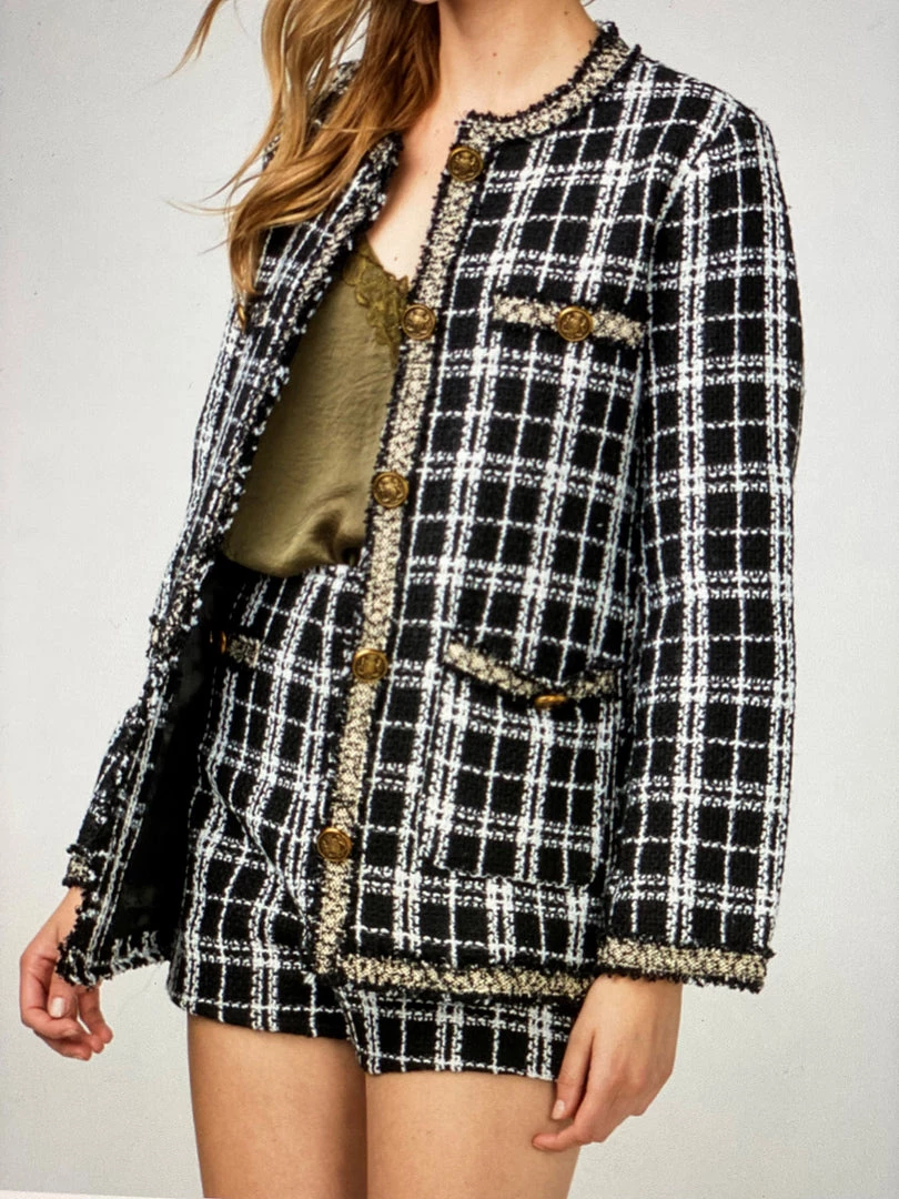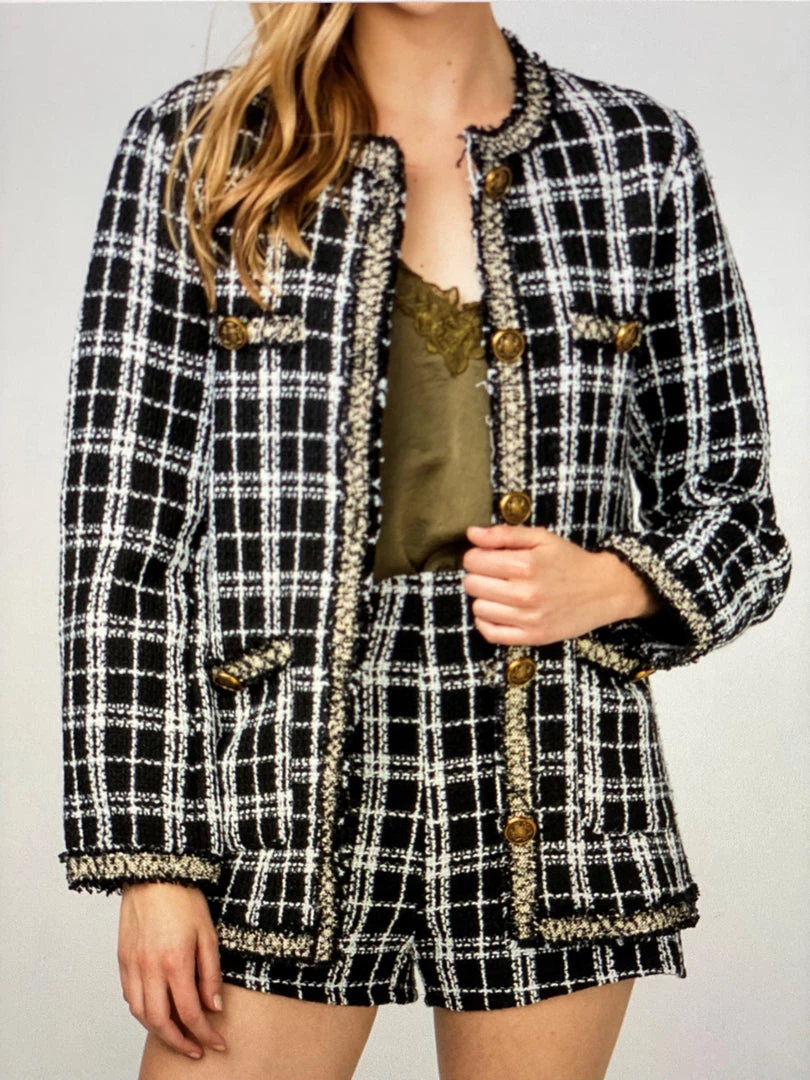 Plaid tweed jacket featuring gold buttons and trim. Pocket detail at front. Non-sheer, woven, lightweight. Body is lined.