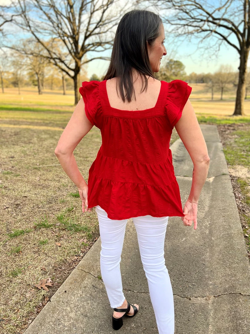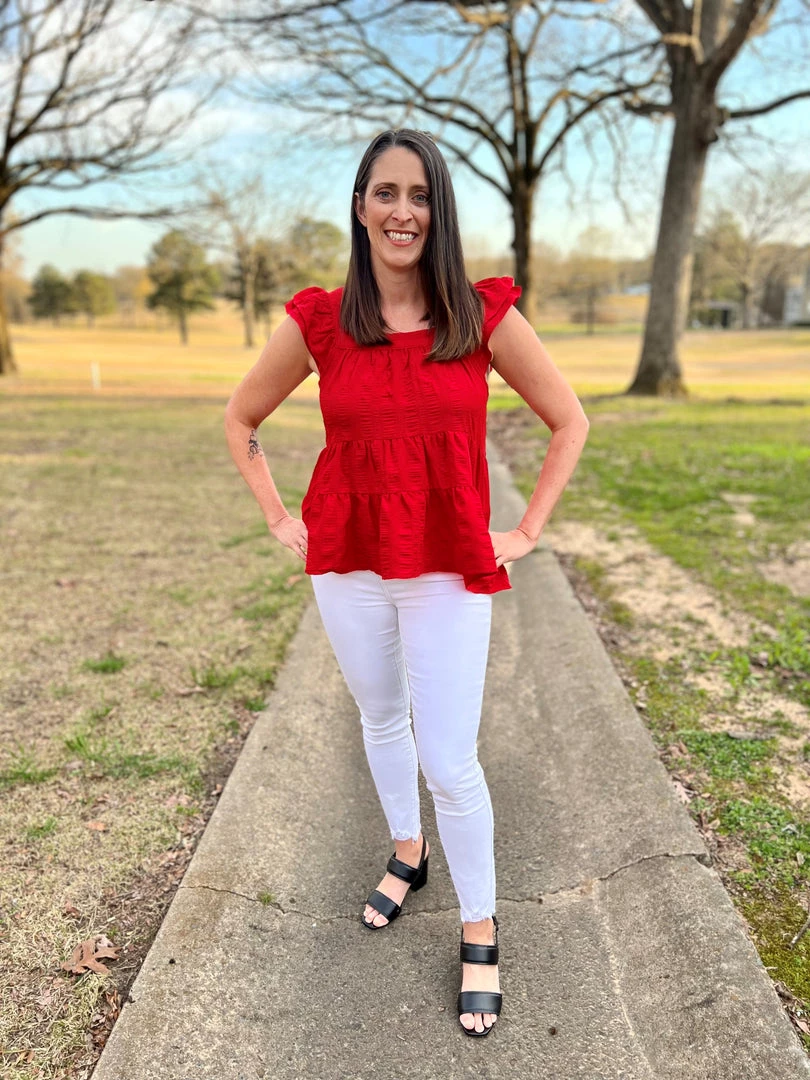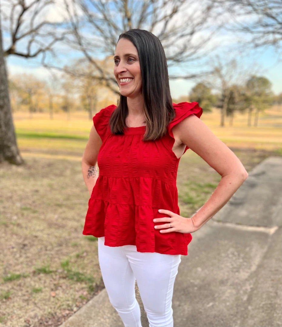 Solid textured sleeveless square neck top featuring ruffle detail at shoulder. Unlined and woven with an A-line design. Lightweight. 97% Polyester, 3% Spandex. Brand is Entro
