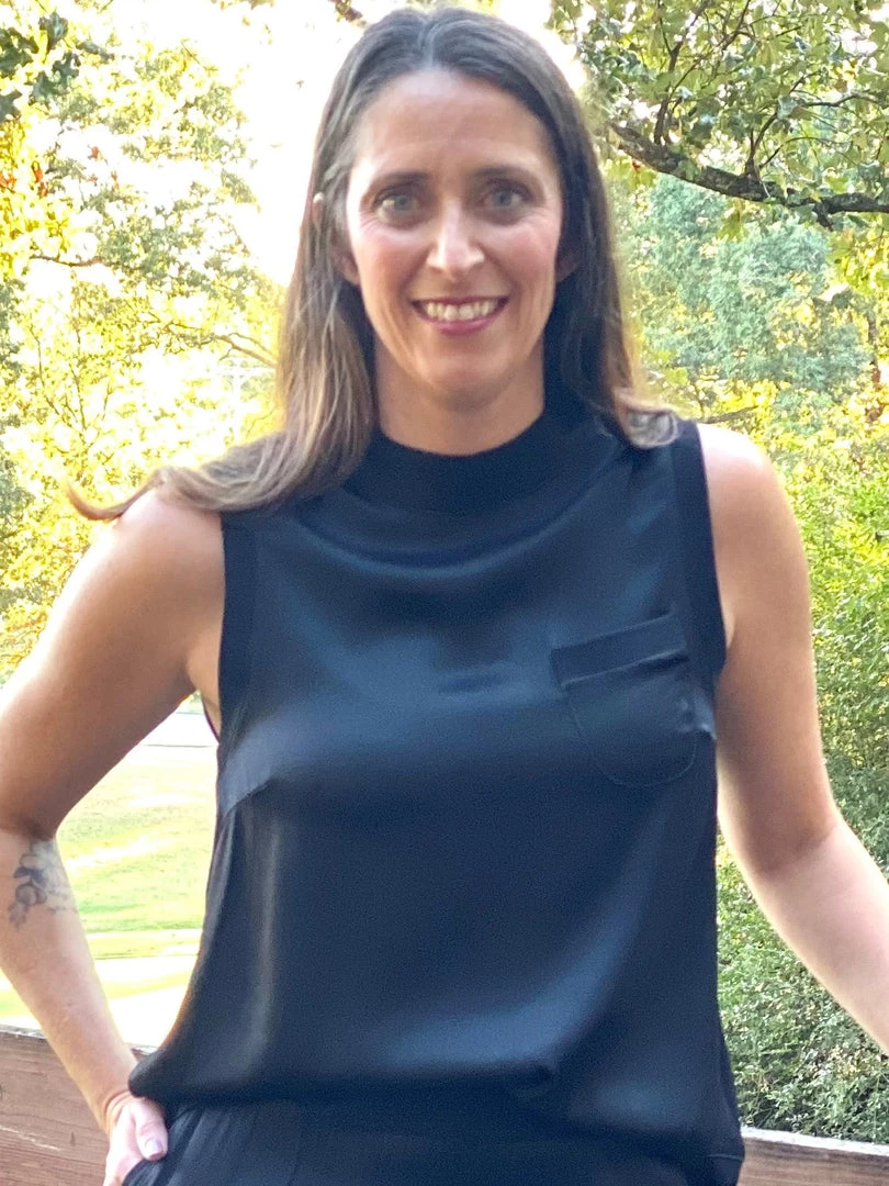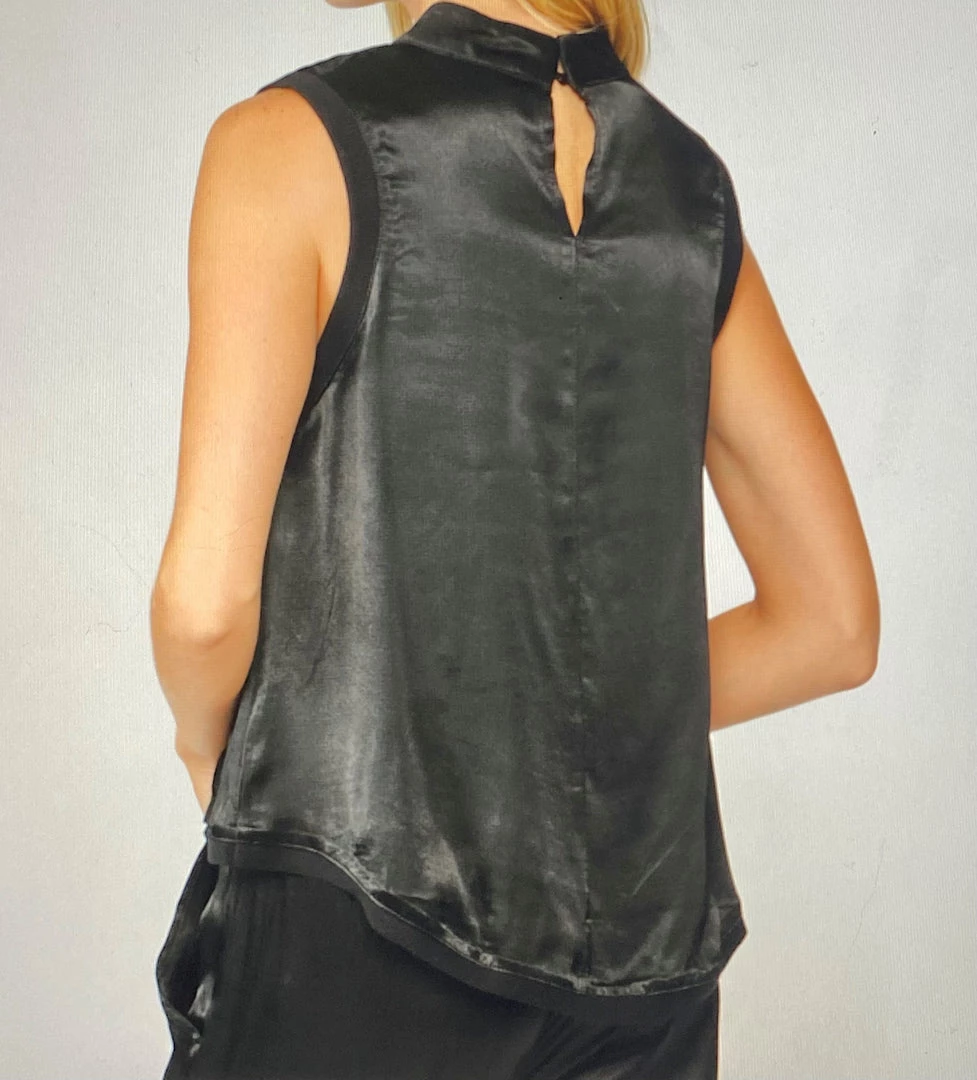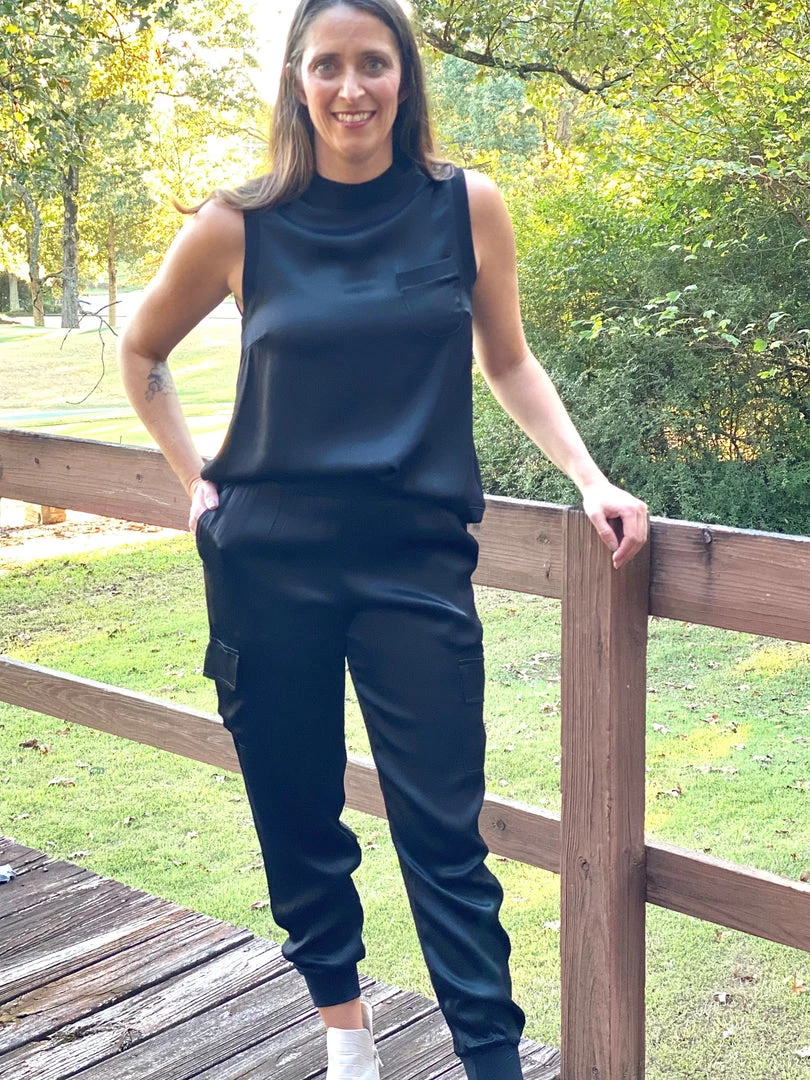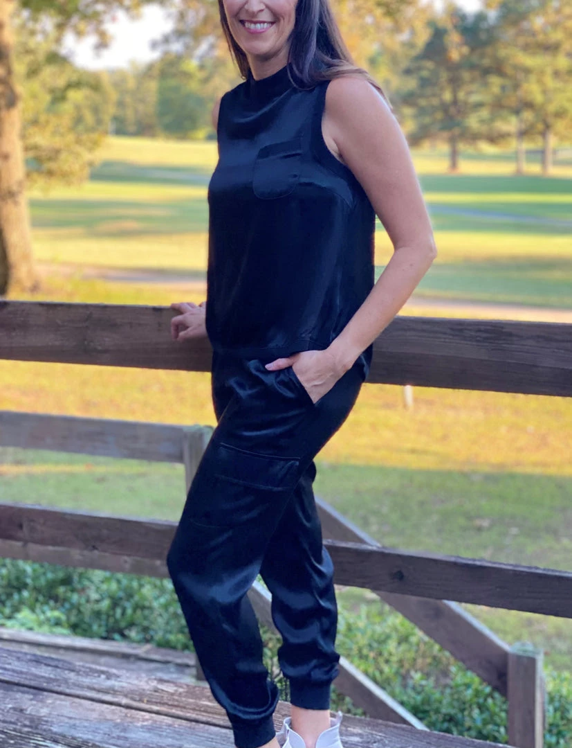 The black satin top is a perfect pair with the black satin jogger pants. Wear it under a blazer or jacket for a sleek and trendy look. Made of viscose and cotton. Banded crew neck and arm openings.