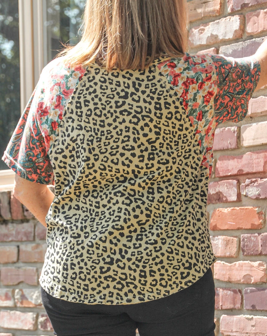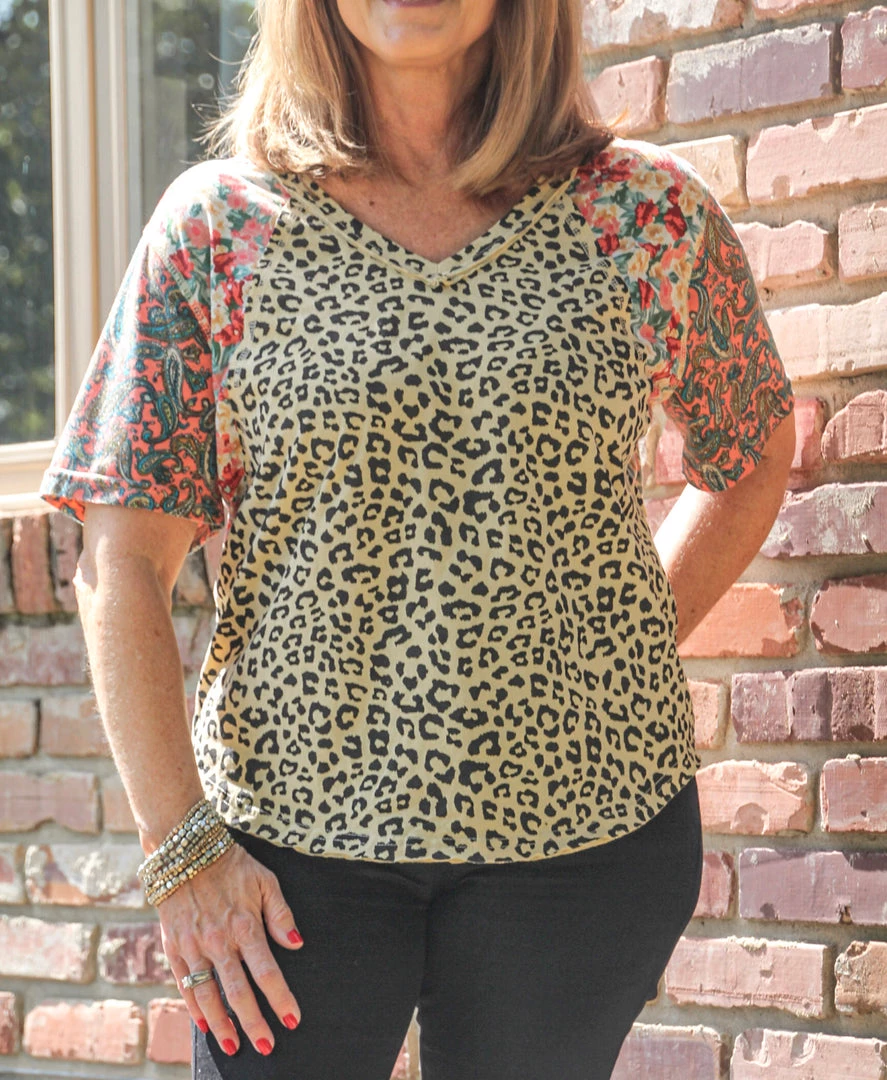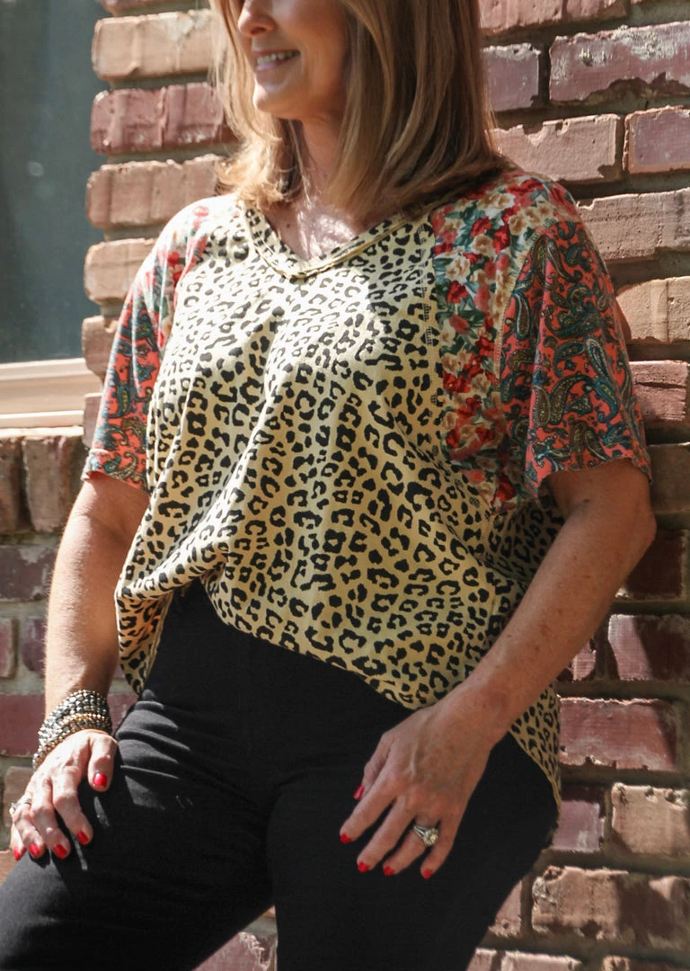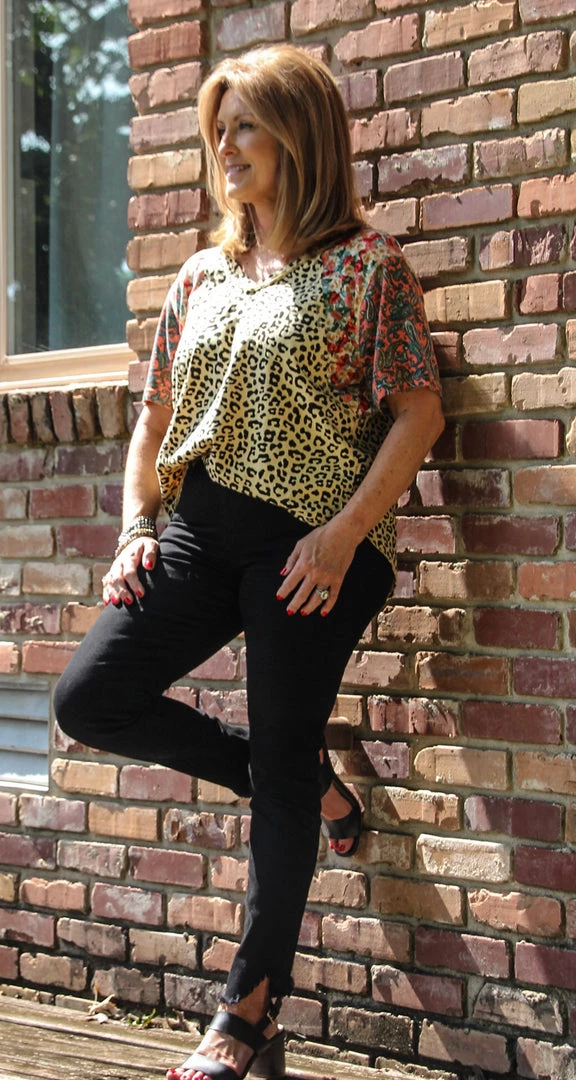 This v-neck mixed media top pairs floral touches with animal print for a perfect combo! Made with quality fabric and great cut lines. You can pair with shorts for the Summer, and it will work well into Fall with black jeans as pictured. Don’t miss this one!
