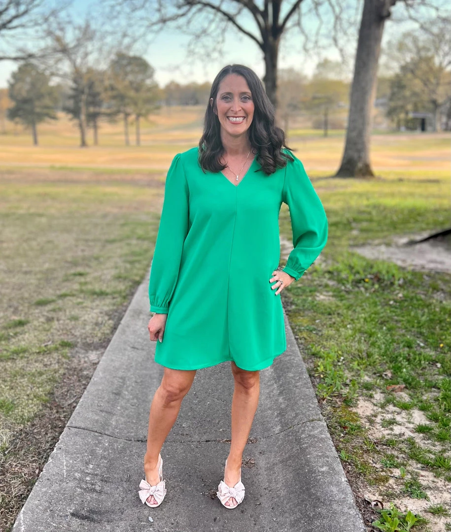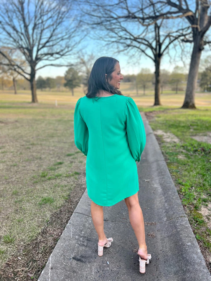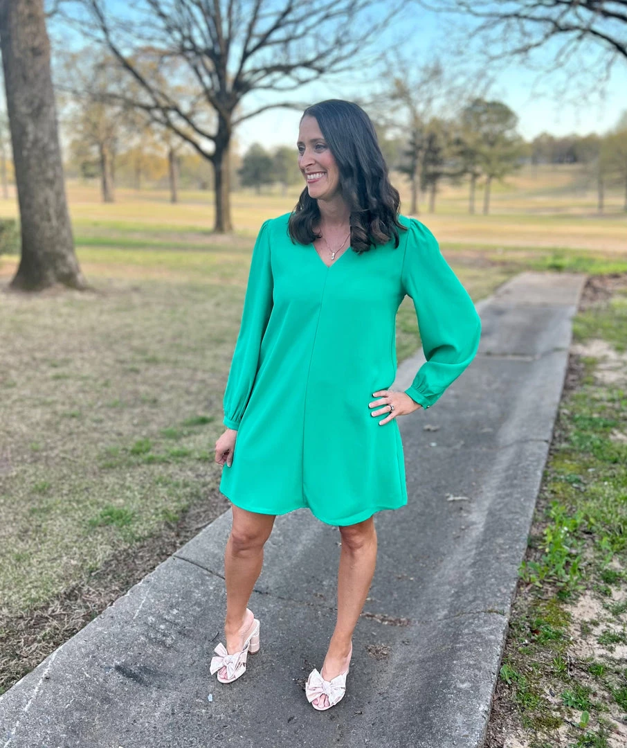 What a gorgeous green jewel tone dress! Solid dress with a V-neckline and long bubble sleeves.  Unlined, non-sheer, lightweight.