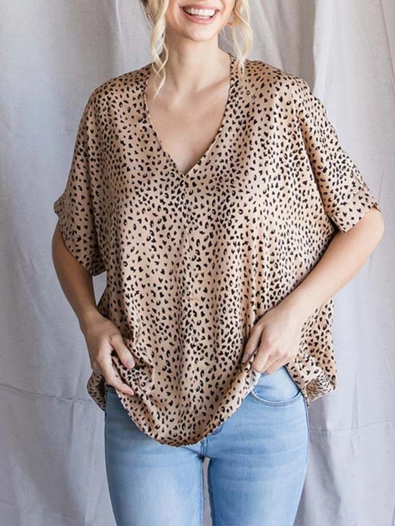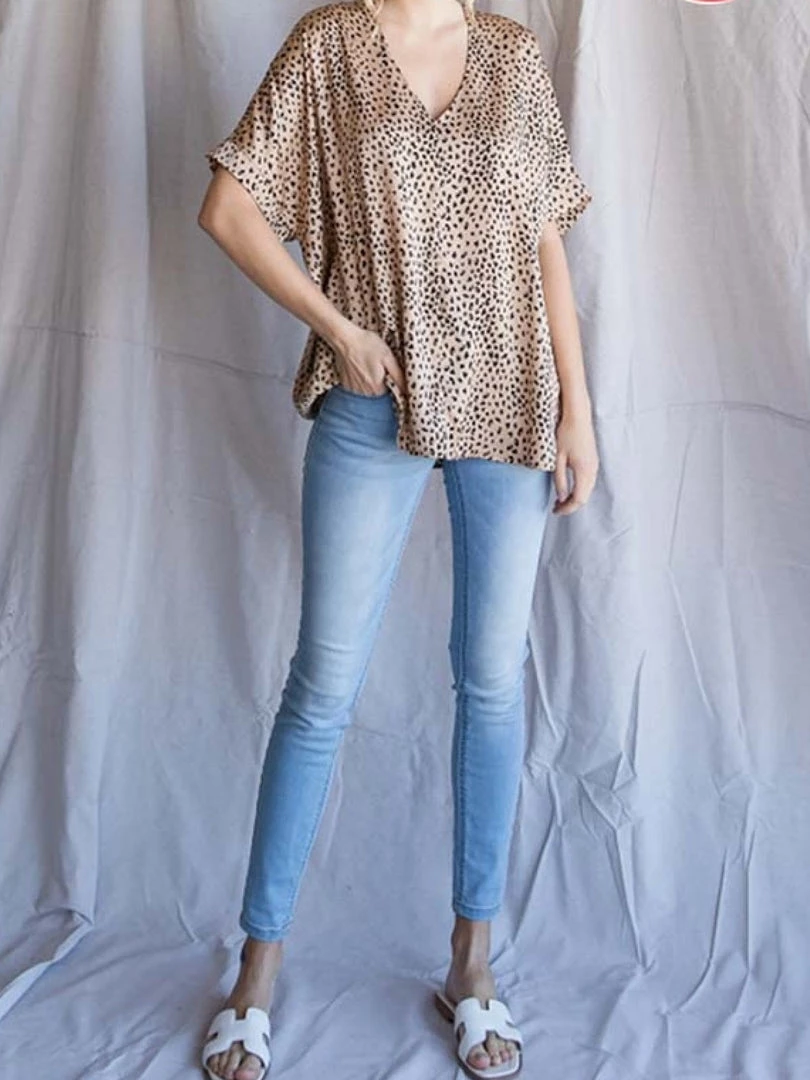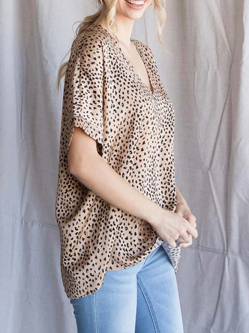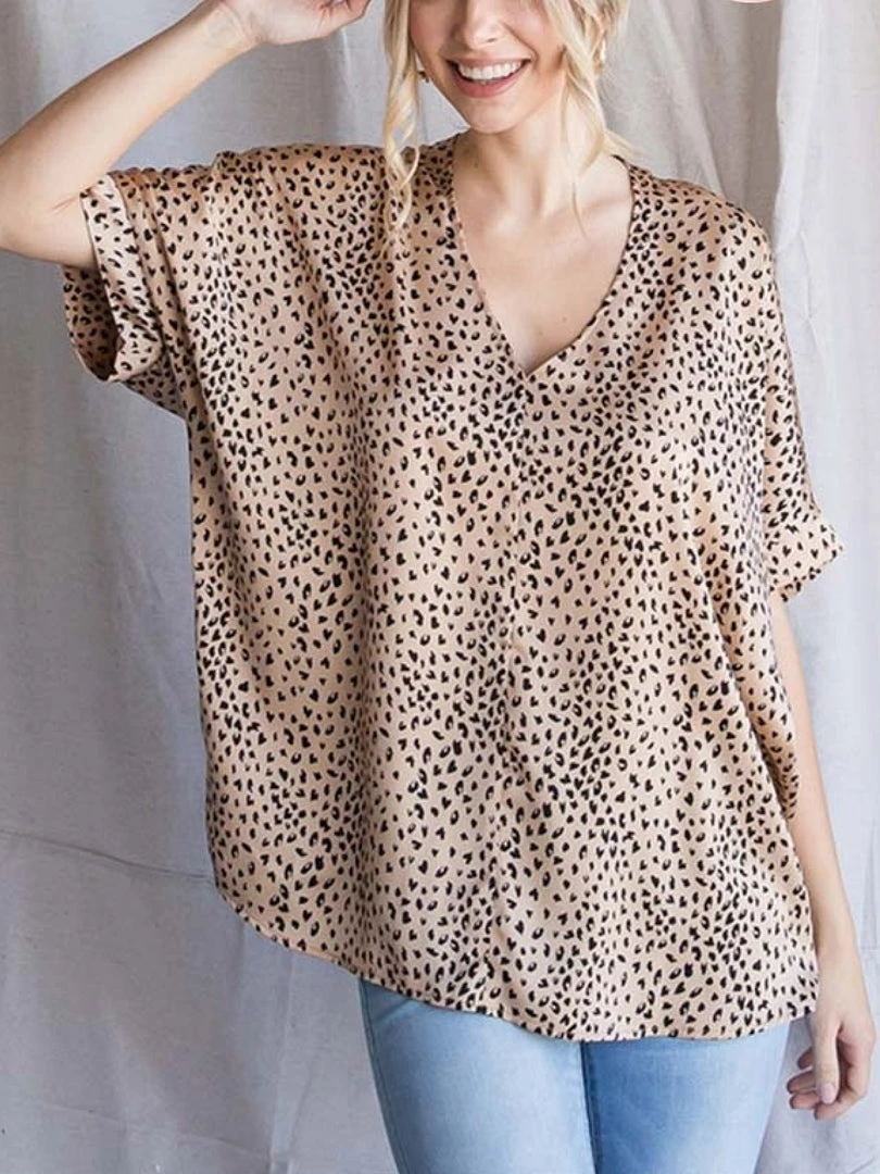 Satin leopard print boxy top with a V-neckline and dolman short sleeves. Extended sizes and a generous cut for a loose fit and flow. Extended sizes. 100% Polyester