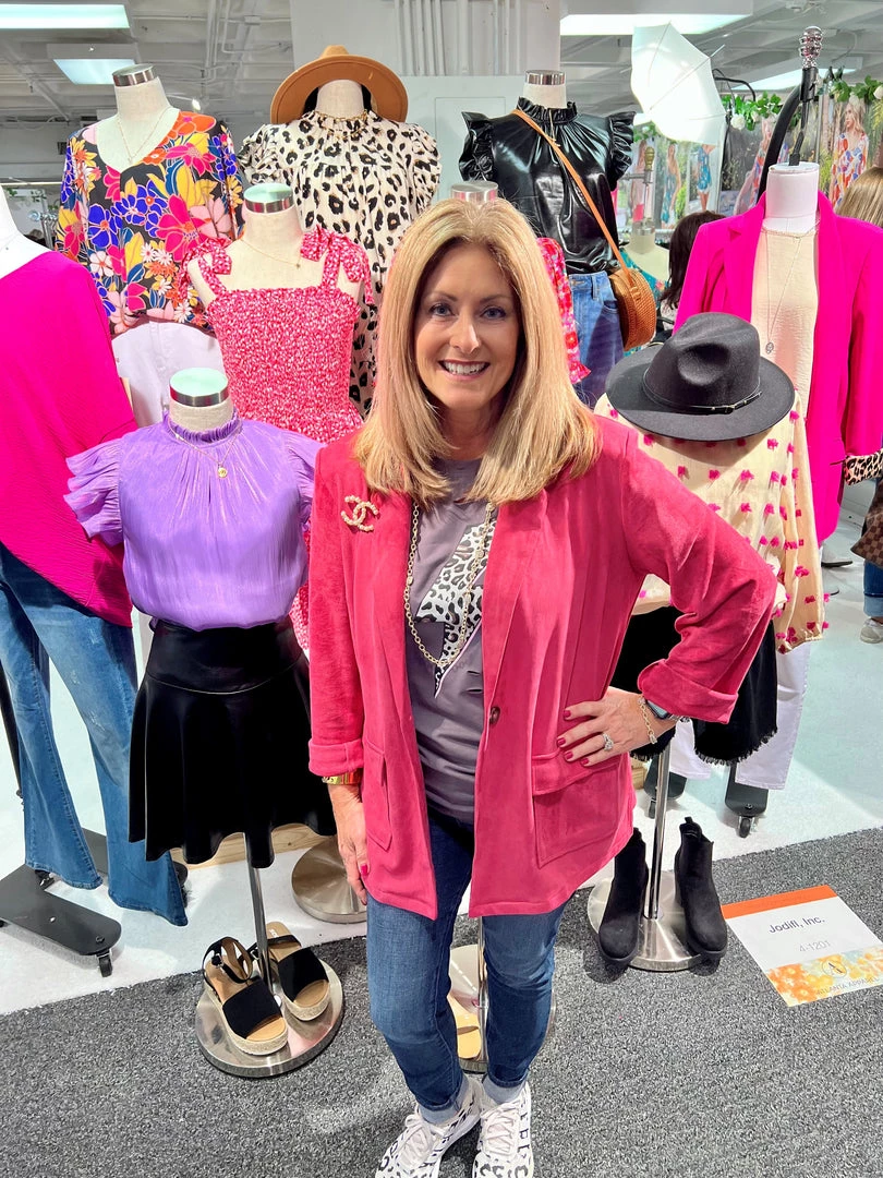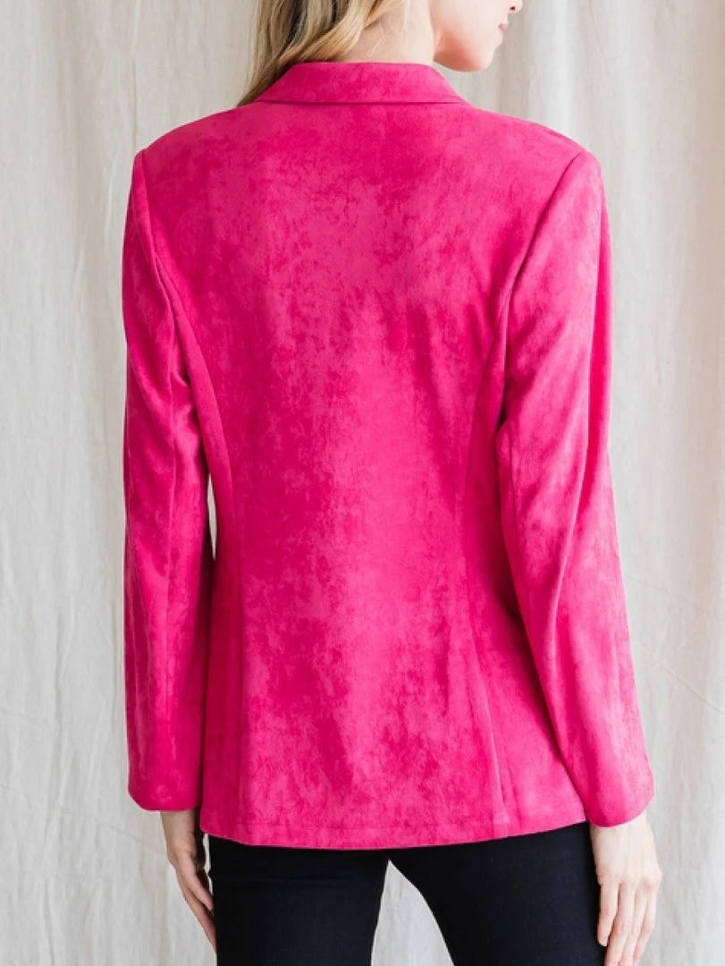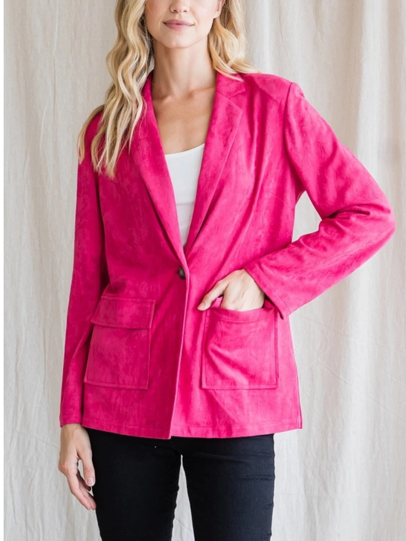 What a gorgeous color and feel in the Pink Party Blazer! Solid faux suede with a collared neckline, long sleeves, and front flap pockets. Single button front, non-sheer, lightweight.