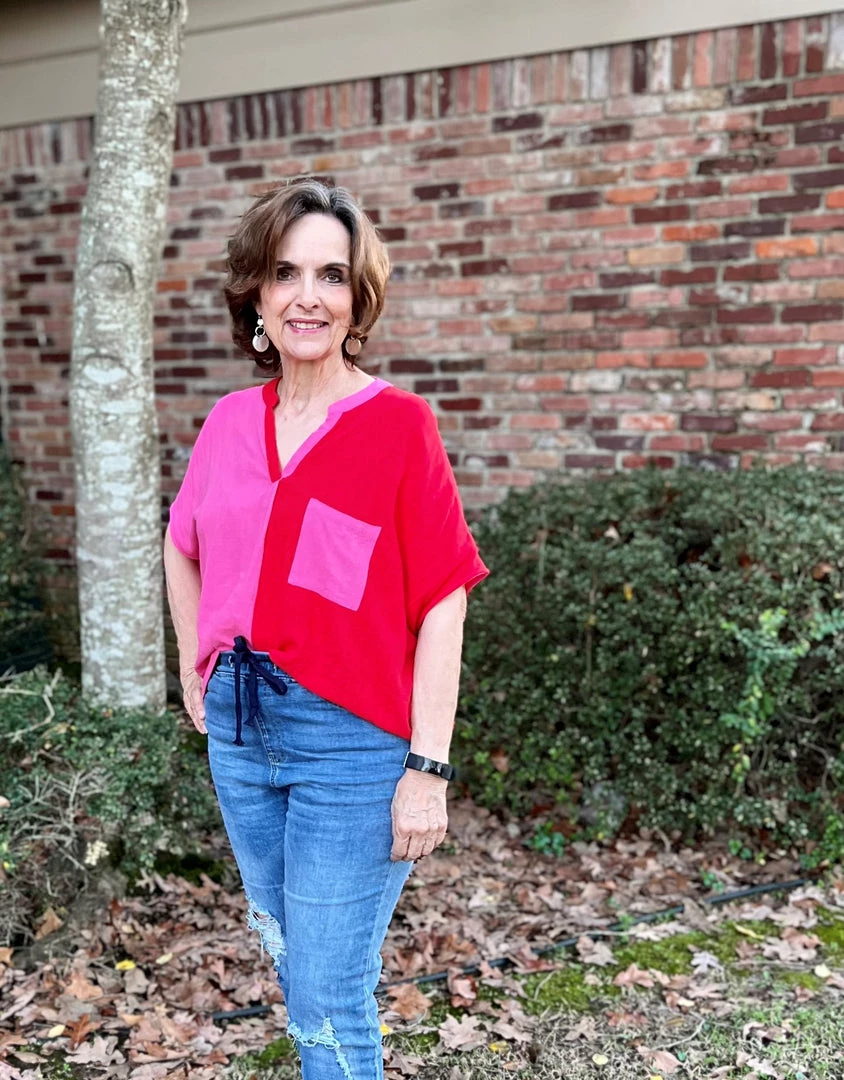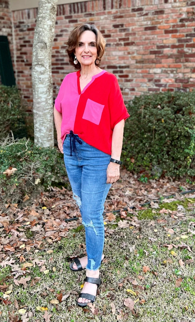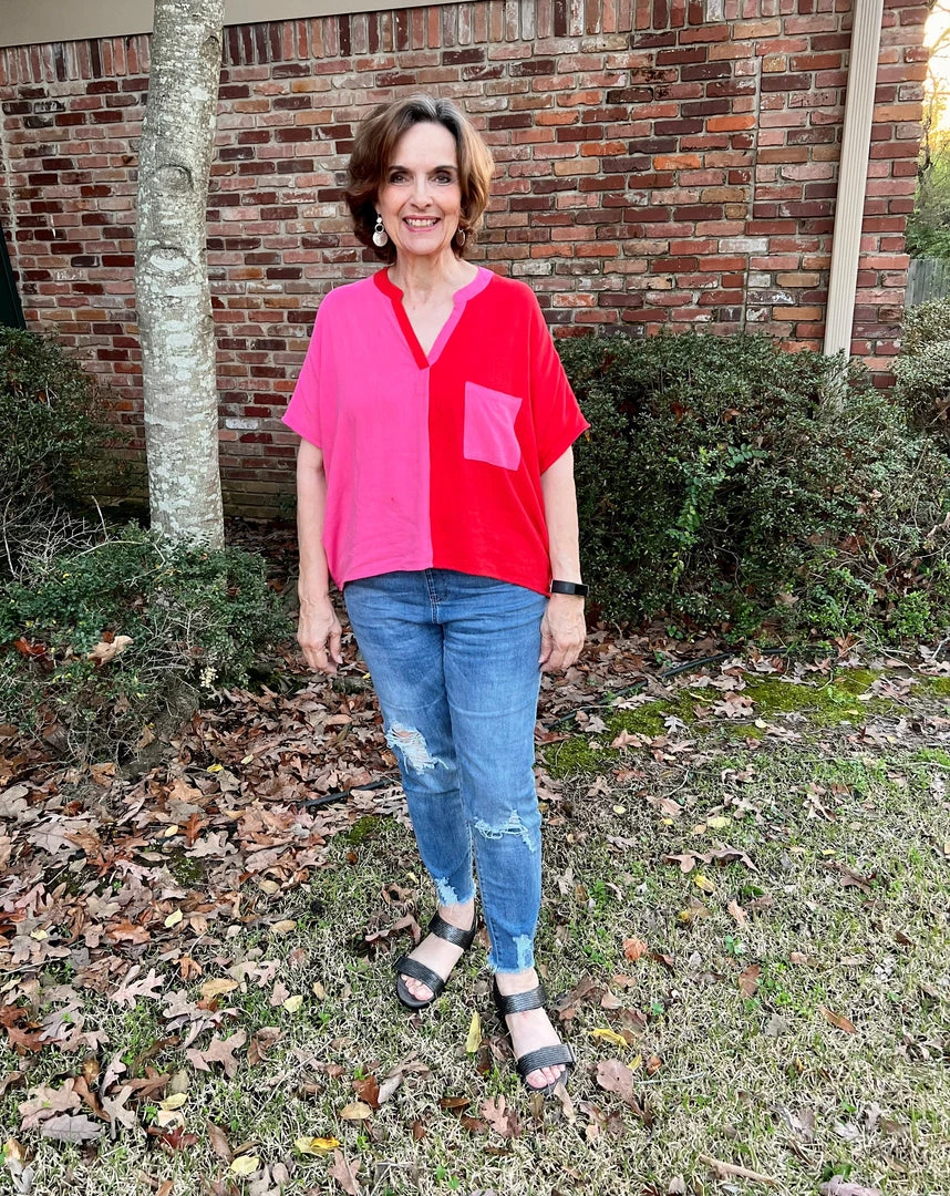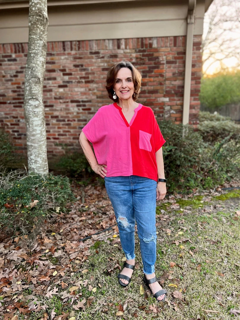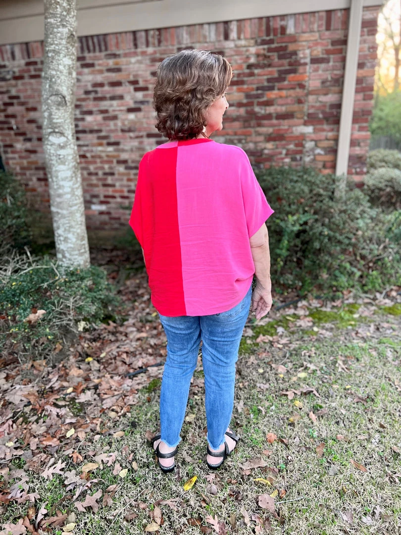 Color block is here to stay and how awesome is this Red and Pink one?  Color block linen blend top with a collarless neckline, a chest pockets, and short sleeves. 70% Rayon, 30% Linen
