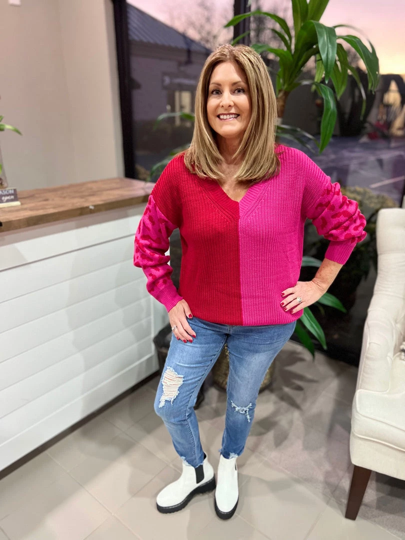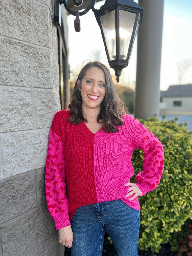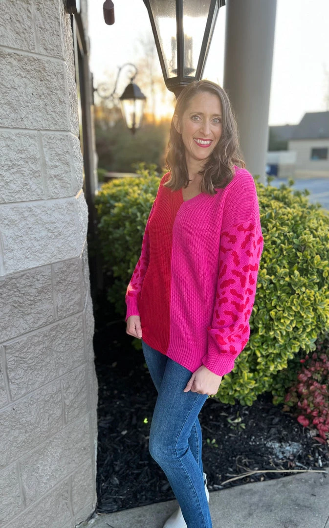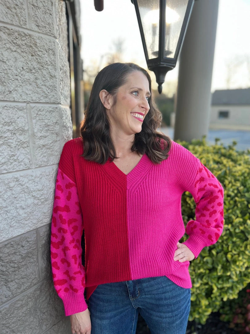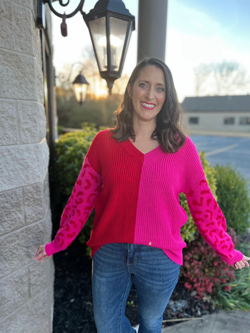 Dynamite two tone knit pullover sweater with a V-neckline and leopard print sleeves. this sweater combines red and pink for a beautiful, feminine look. Lightweight and non-sheer. 100% Acrylic