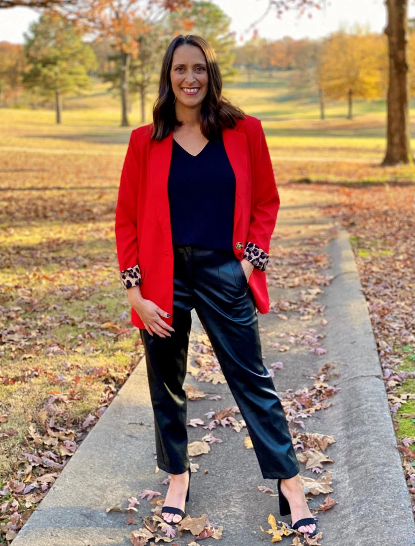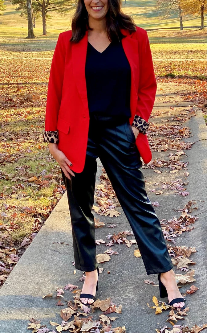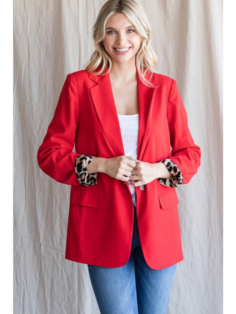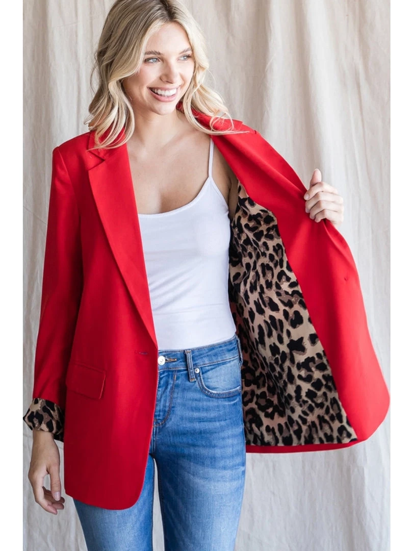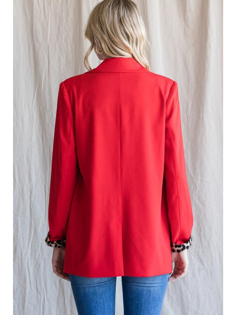 Gorgeous solid red blazer with leopard print lined details inside body, long sleeves, and front pockets. Single button front, non-sheer, lightweight. Can easily dress up or down!