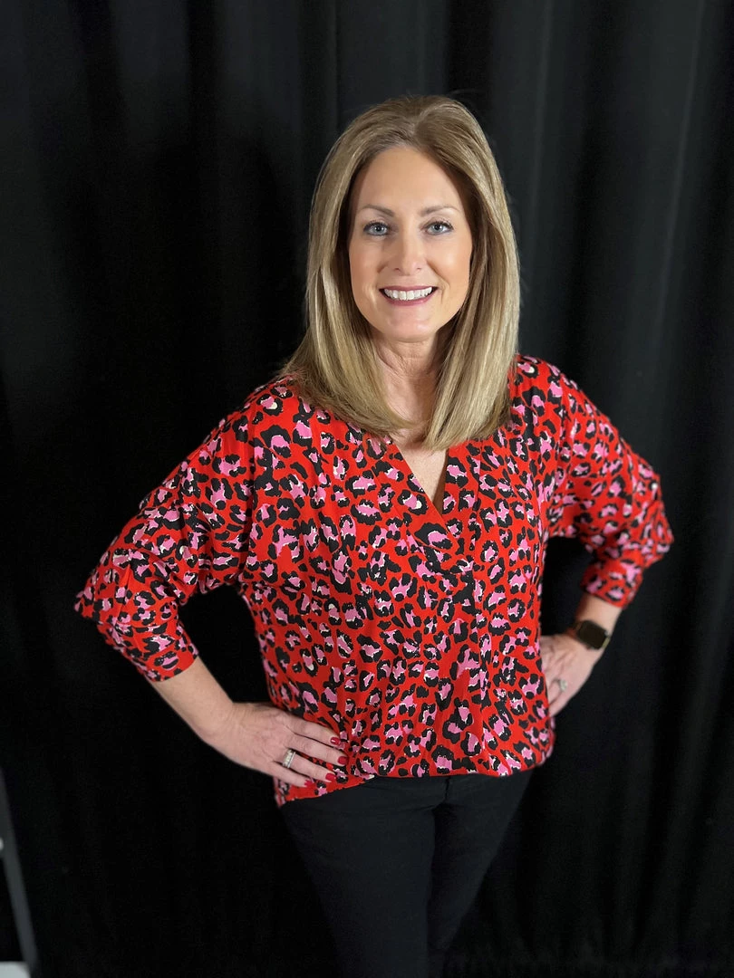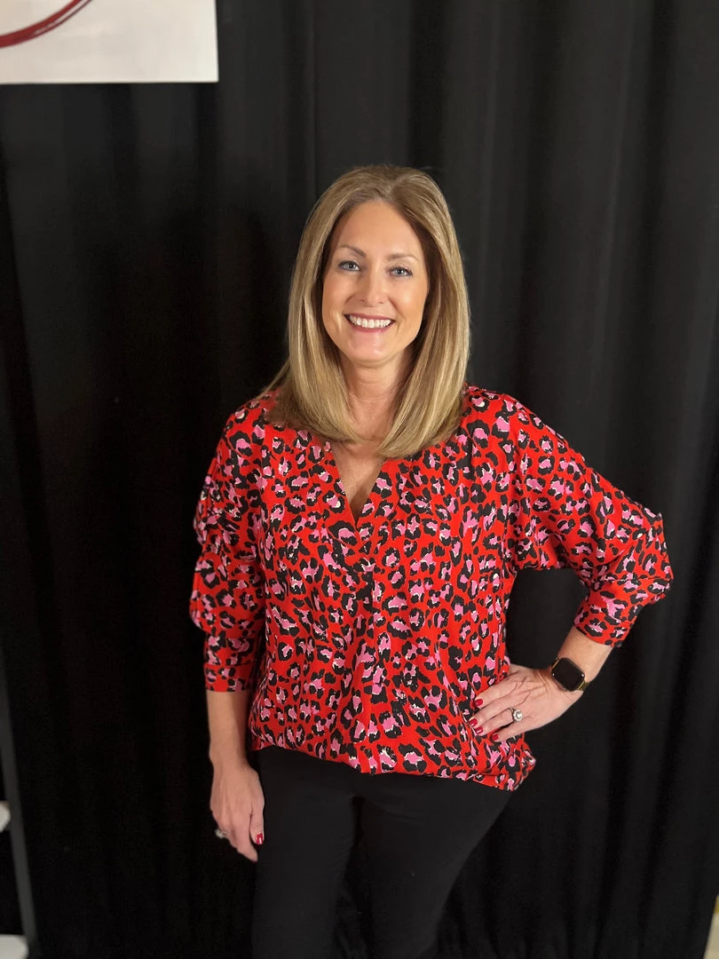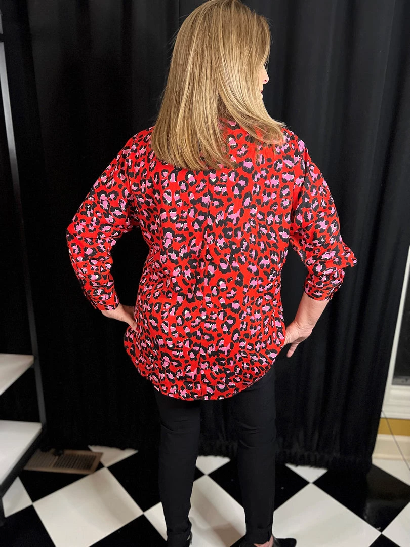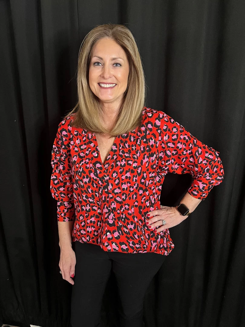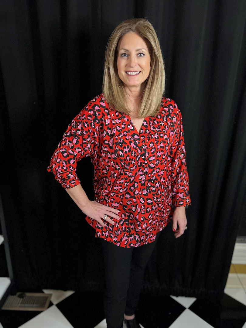 We love the colors in this top! Leopard print in fantastic color pattern top with a V-neckline and ruffle edge long bubble sleeves. Stand out in a crowd in this beautiful top.