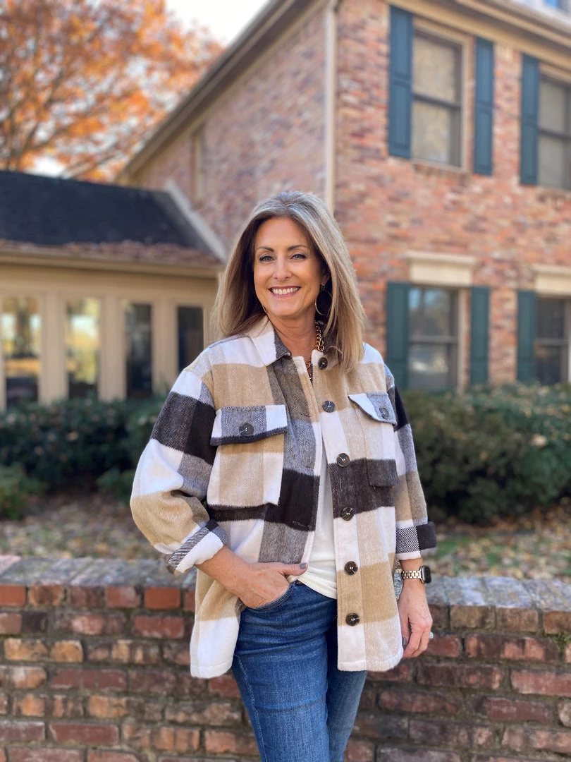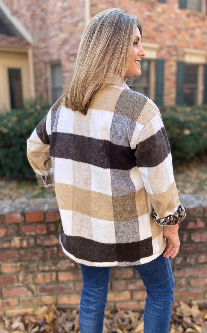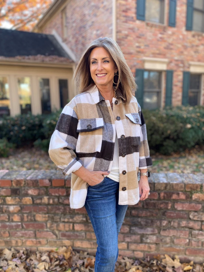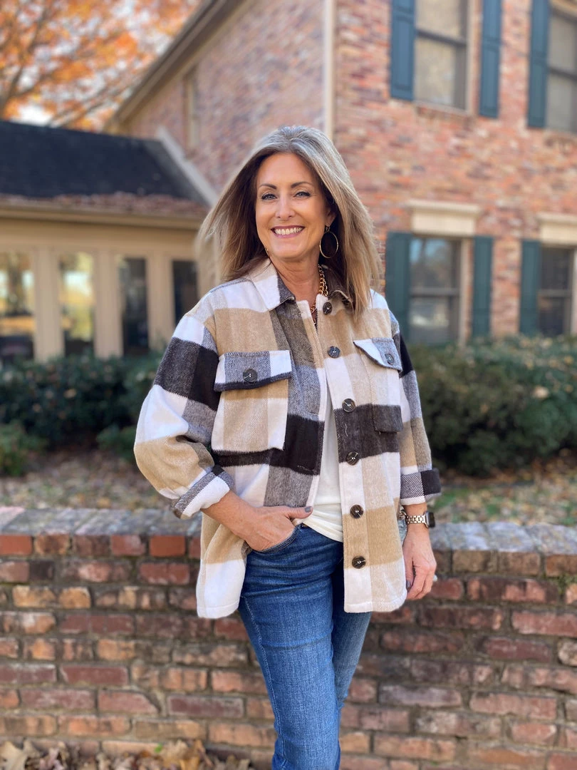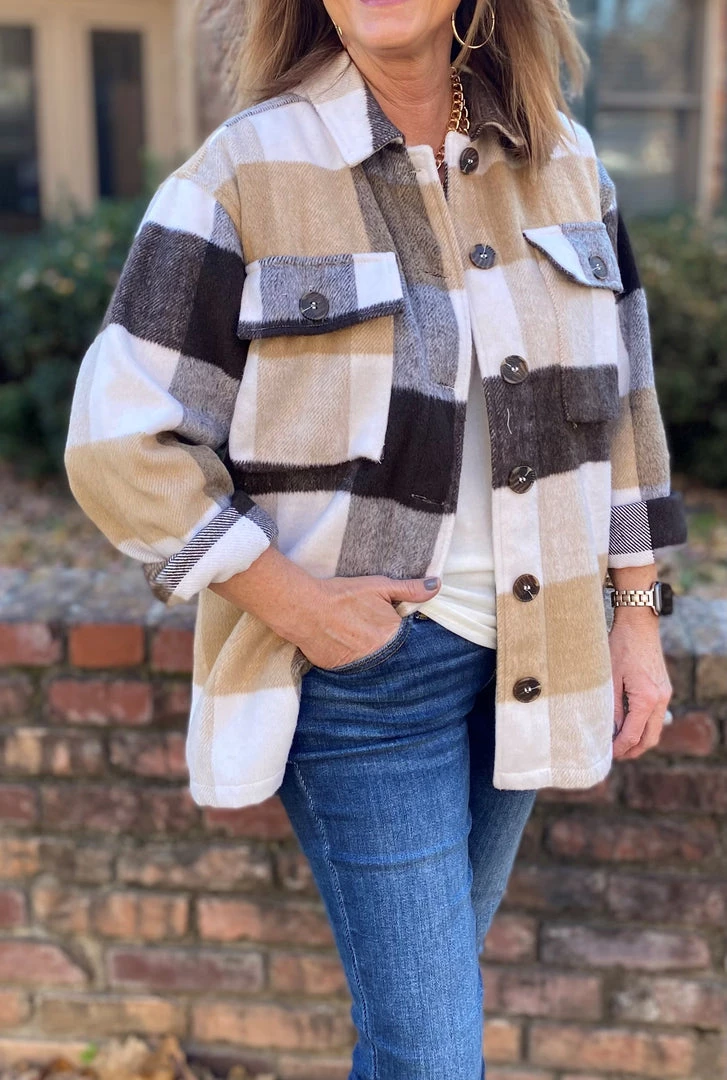 This shirt jacket is very soft and warm. It will keep you toasty this season and goes with just about anything. Not itchy, machine washable.