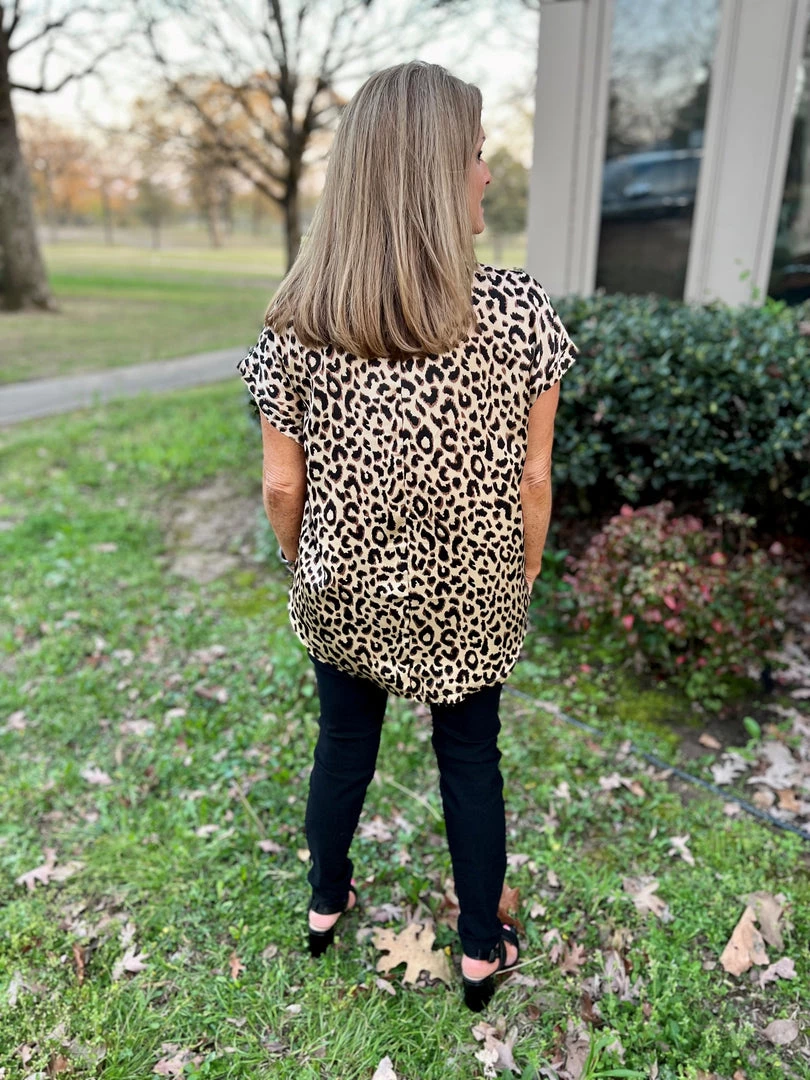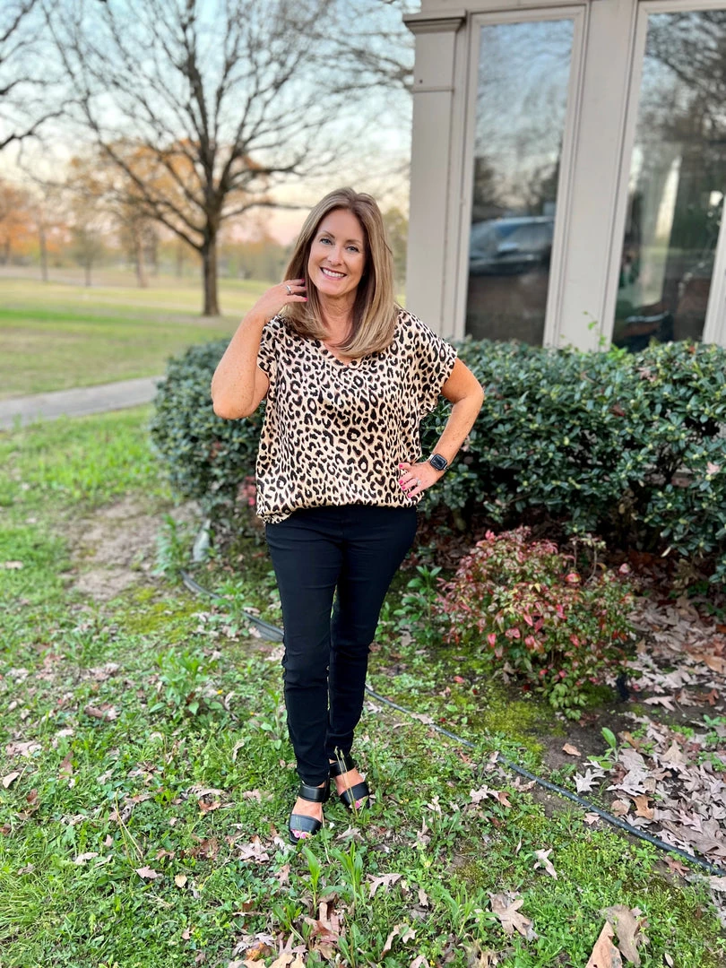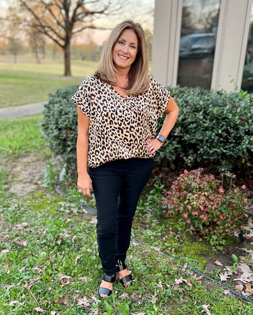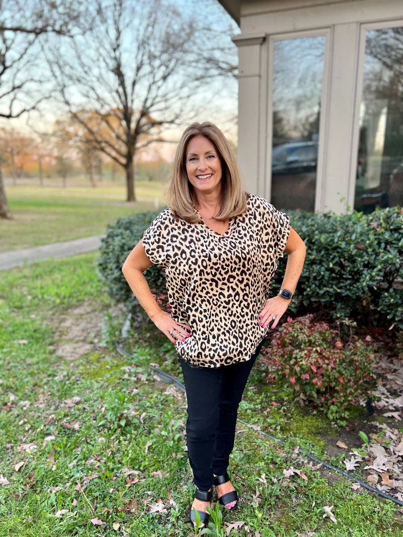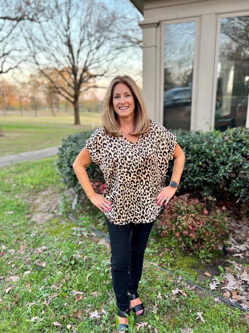 Satin is so hot right now, and this leopard print top with a V-neckline and short cap sleeves is sure to be a hit for the Spring/Summer….or anytime of year!  Unlined, non-sheer, lightweight.
