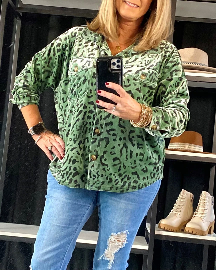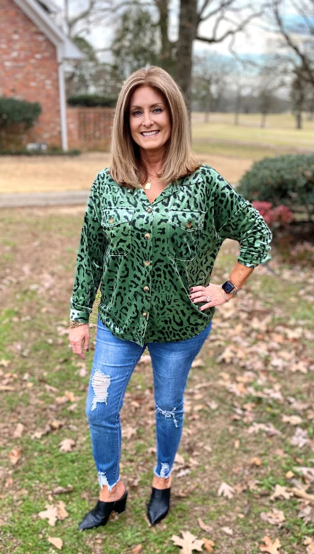 This top is one of our favorites! Long sleeve, button-up, collared velvet shirt with chest pocket and so soft. Scooped hemline for a feminine look. Wear with jeans or dress it up with pants. 95% Polyester, 5% Spandex