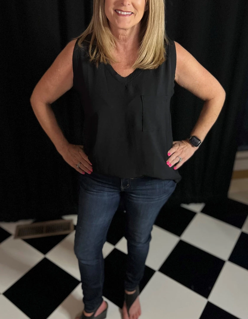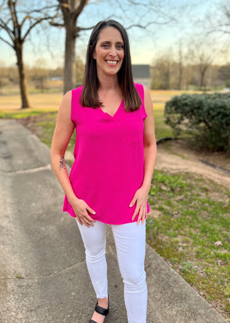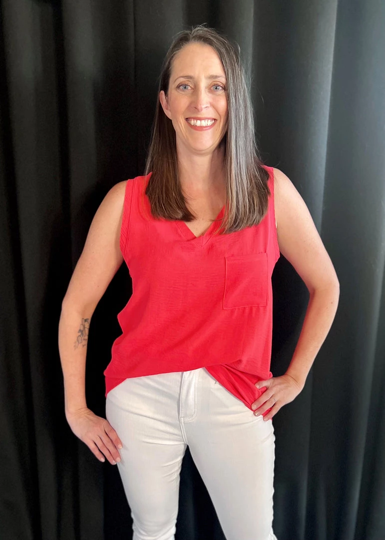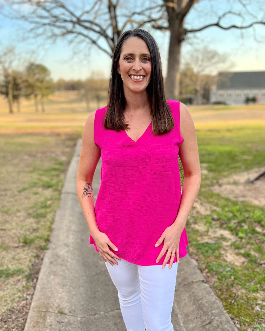 What a beautiful pop of color to add to any outfit! Solid sleeveless V-neck tank top with a chest pocket. Unlined, non-sheer, lightweight. Great for layering!
