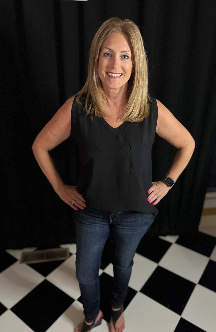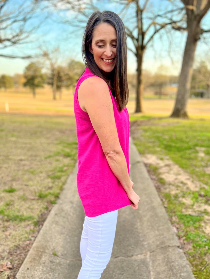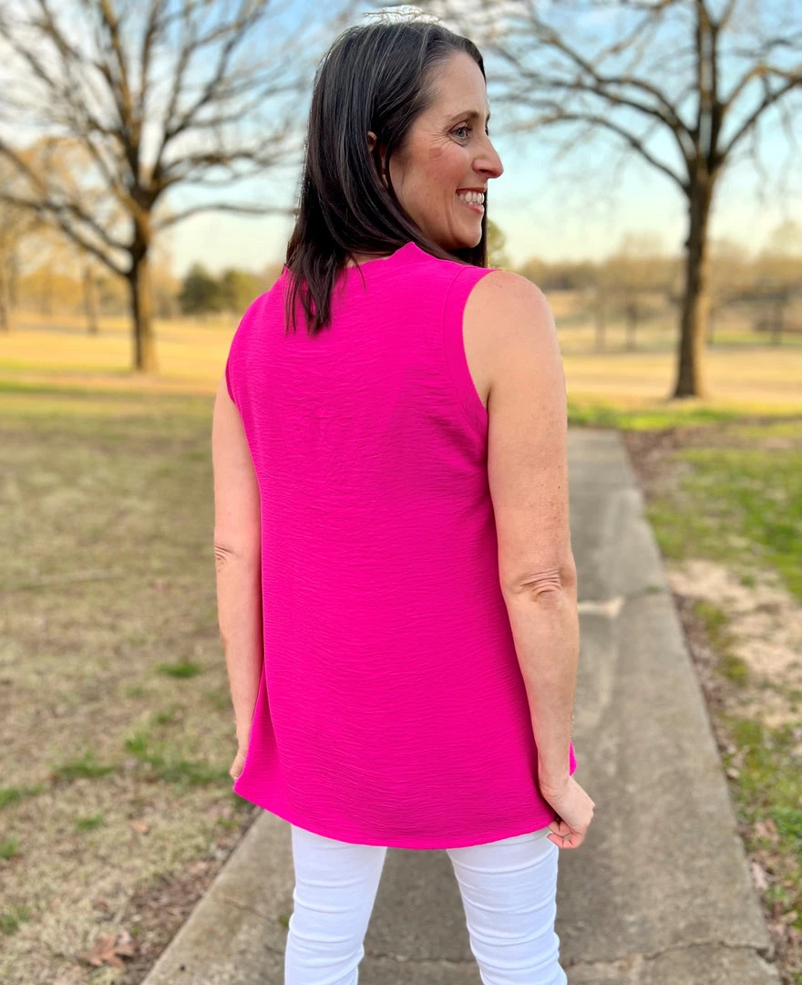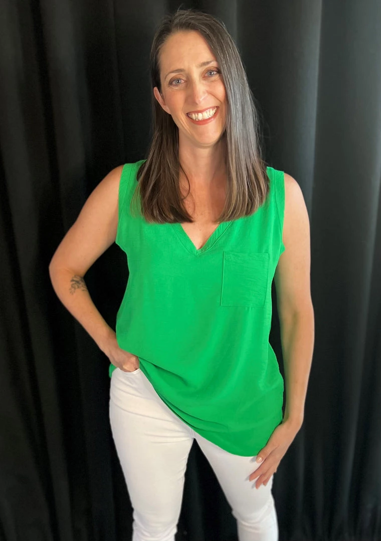 What a beautiful pop of color to add to any outfit! Solid sleeveless V-neck tank top with a chest pocket. Unlined, non-sheer, lightweight. Great for layering!