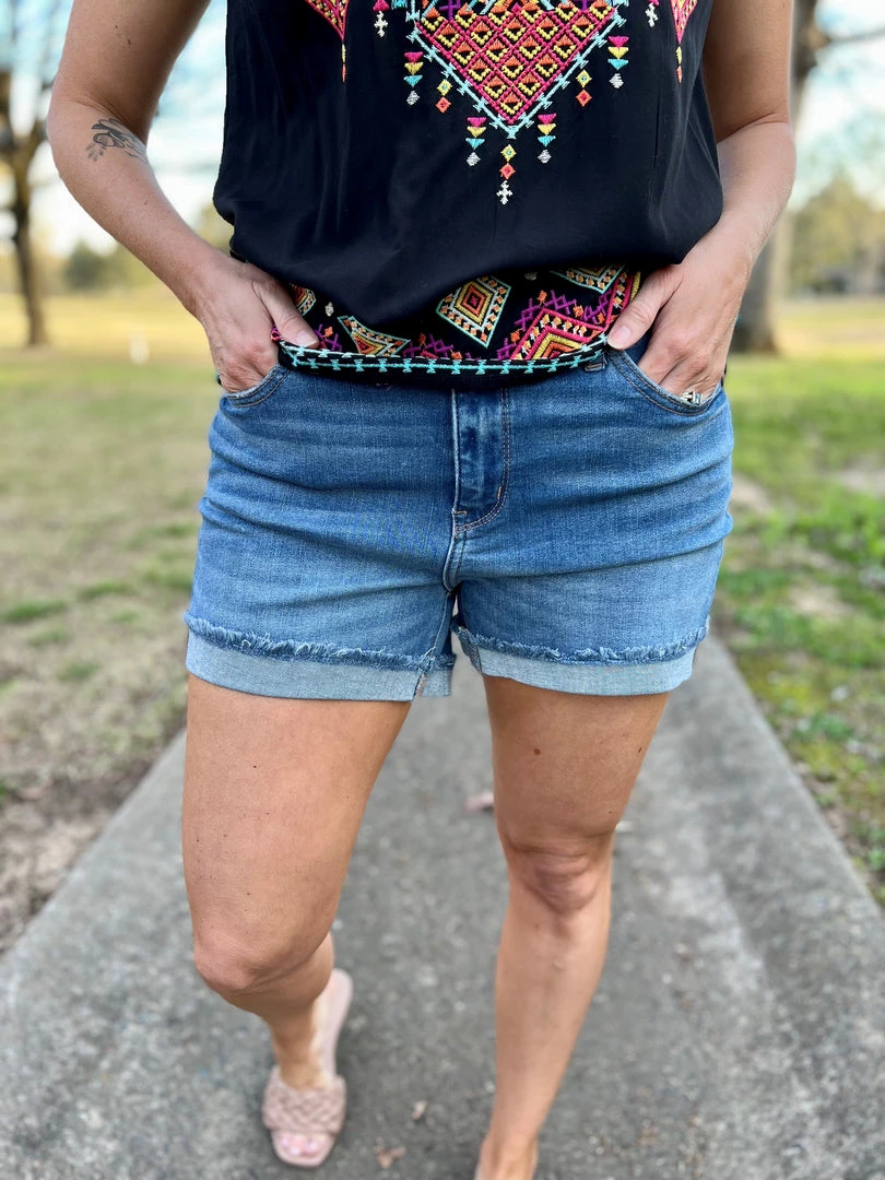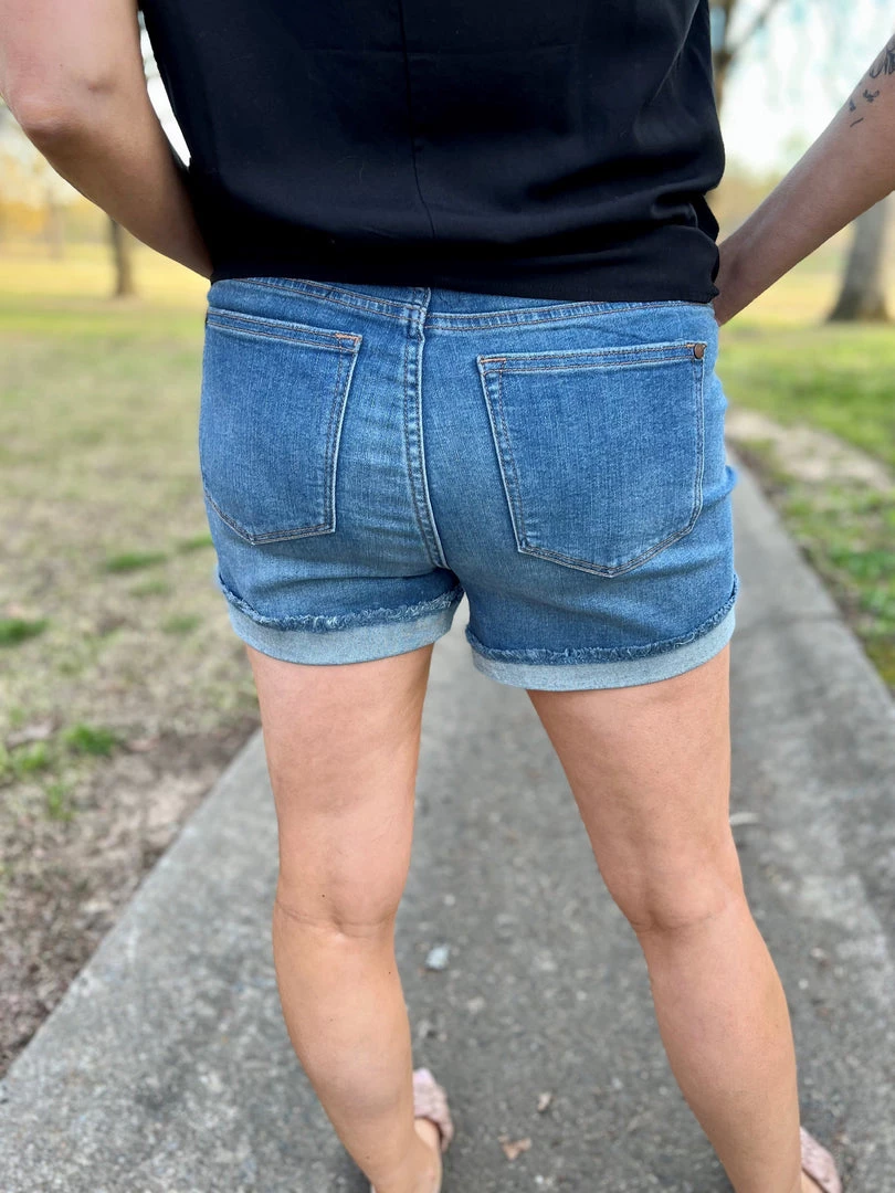 Need some denim with no distressing? We have you covered! These cuffed hem shorts are a 3.75 inch inseam when cuffed. Rise is 9.75 inches.  71% Cotton / 21% Rayon / 7% Polyester / 1% Lycra. Brand is Judy Blue