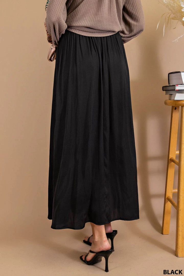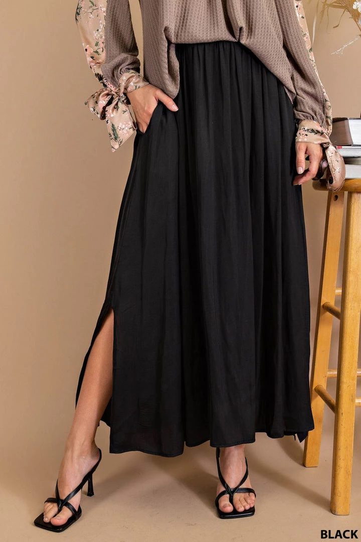 This black basic skirt will be a go to! Flowy with soft pleats and a side slit. Deep pockets.100% Polyester