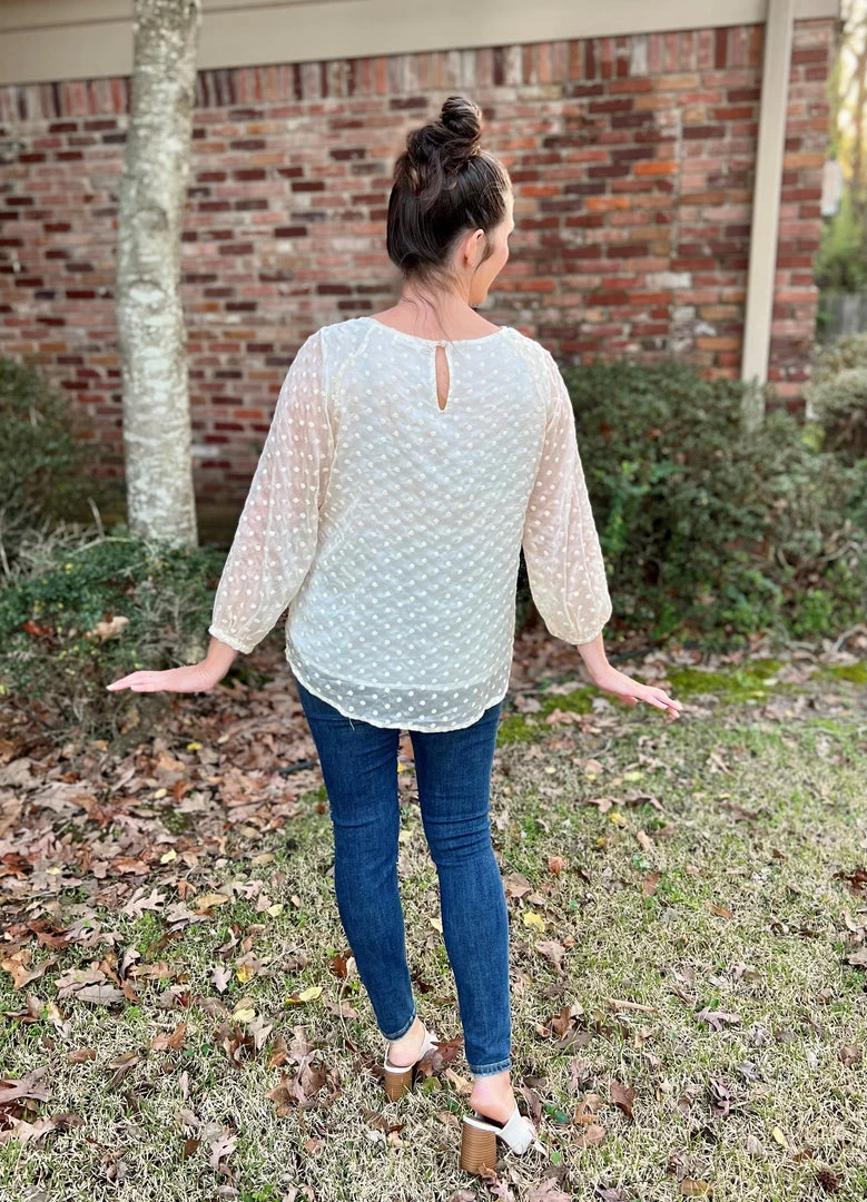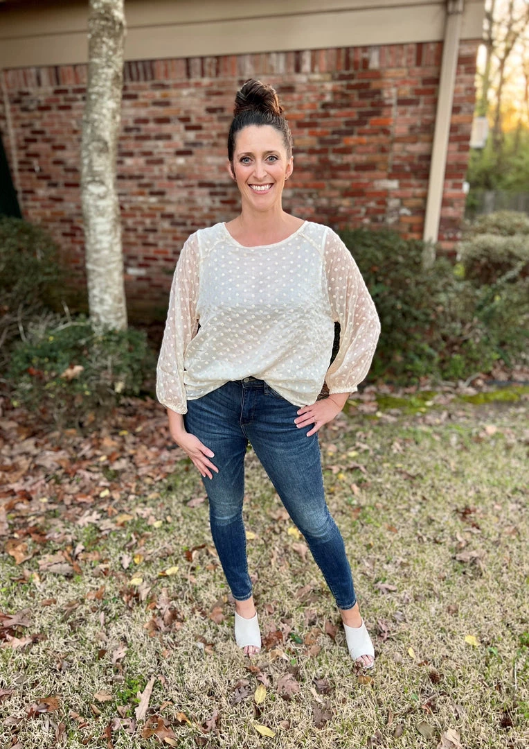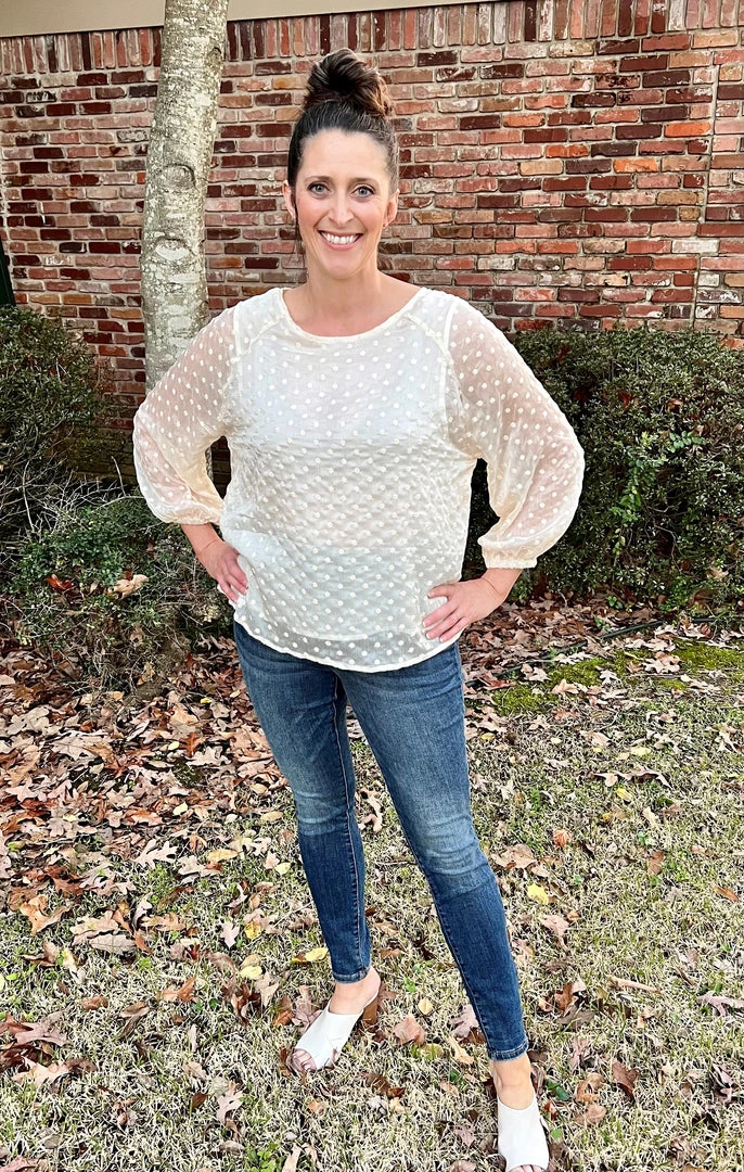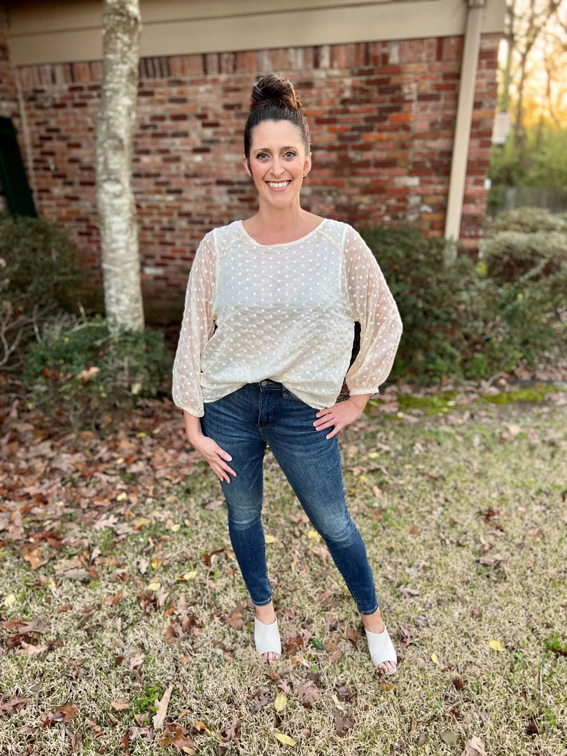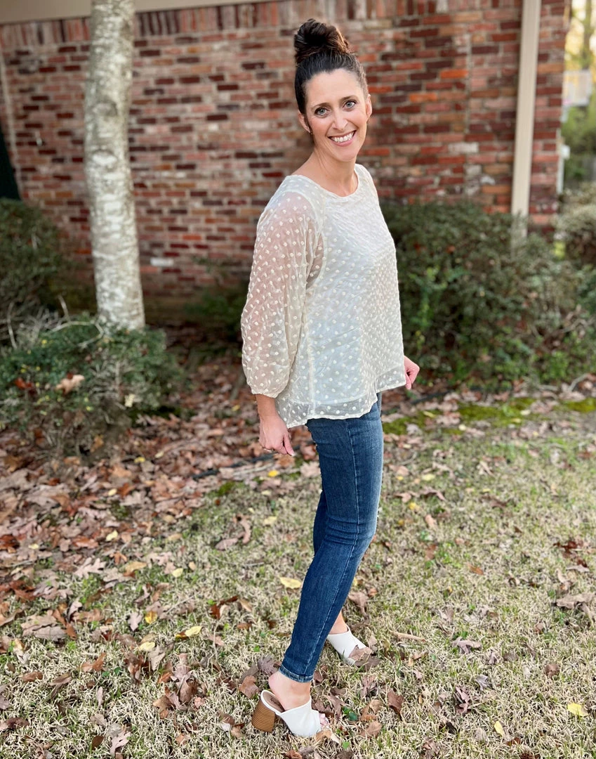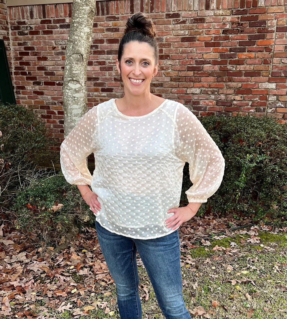 This delicate sheer sleeve with embroidery dots is just amazing. 3/4 length sleeve with a lined bodice and scoop neckline. Brand is Kori America.