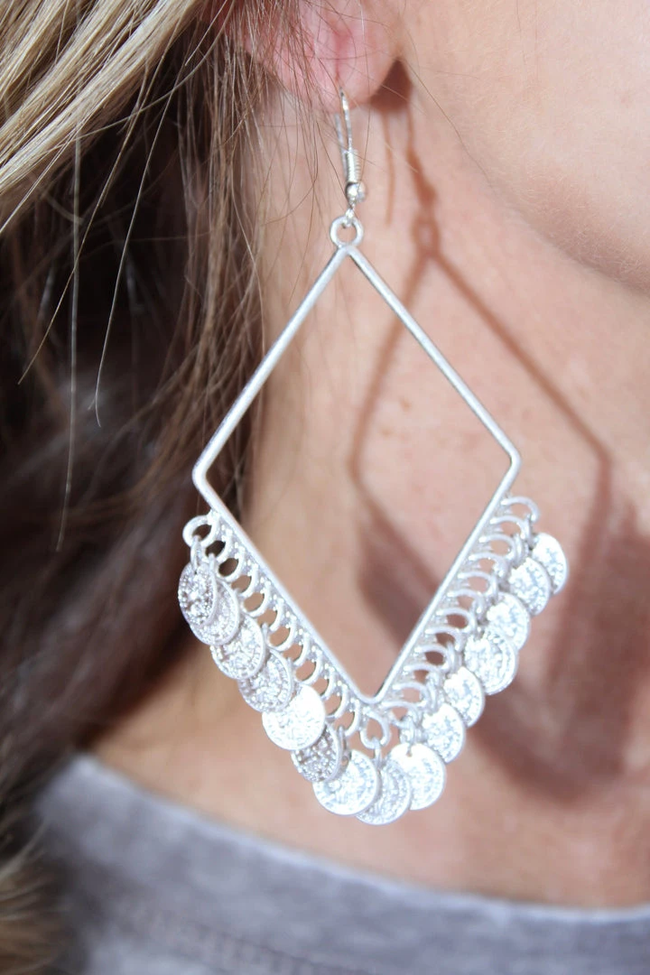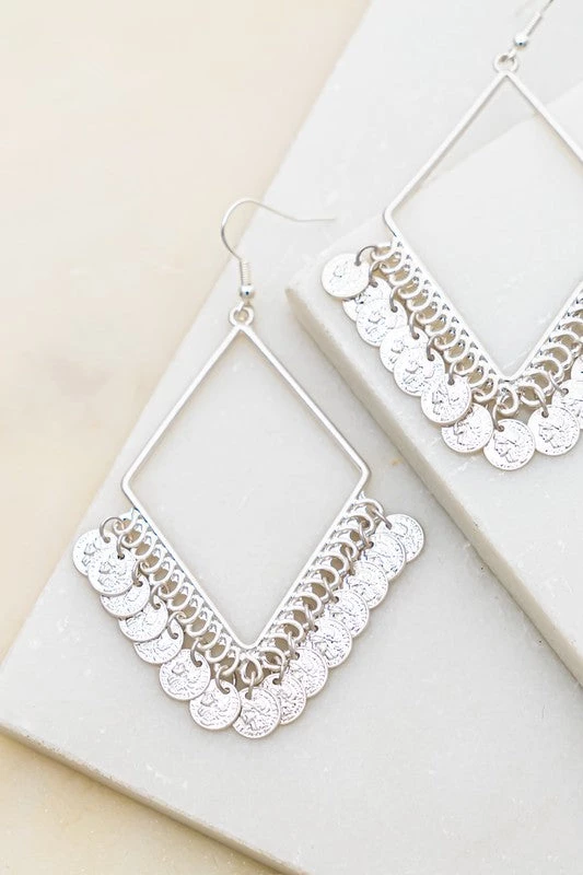 These diamond shape hoops with coin drop earrings are an eye catcher! They are light weight and will not pull on your ear lobes. Great statement piece for any outfit!